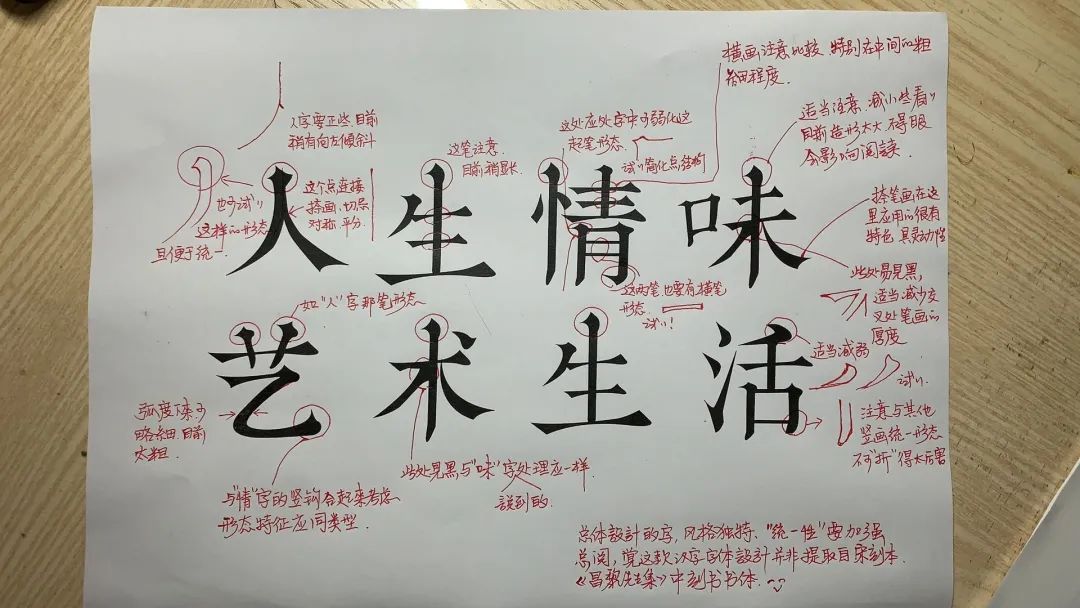 结合疫情,叶峰泉从丰子恺的散文《学会艺术的生活》中提取了“人生情味,艺术生活”八个字,让学生进行字体设计练习。刻书书体是雕版汉字,介于书法和印刷体之间,线条直来直去,有棱有角。叶峰泉曾对刻书书体进行过深入研究,非常适合学生做字体设计练习。刻书书体是现在电脑字库字体中很少见的,他希望通过字体设计的来源从刻书书体中出发,把字体、笔画、构造从中提取出来,选一些有代表性的字让学生练习体悟,了解中华汉字历史文化,增进民族传承意识。同时,他也希望通过练习“人生情味,艺术生活”这八个字,让学生意识到尽管不能返校学习,在家里也要提升内在修养,感悟生活的真谛。