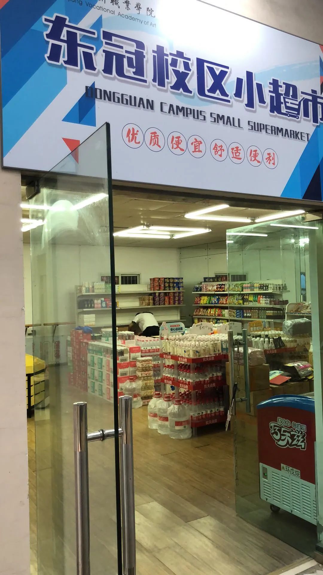 疫情期间,为了确保师生安全,减少进出与其他人员的接触机会,学校对校园实行封闭式管理。为配套东冠师生的日常消费需求、提供便利快捷的服务和优质实惠的商品,东冠校区超市在电工、木工、测试工、供应商同场操作,加班加点中火速启用。5月10日-5月11日7:30-21:30进行了试营业,5月12日超市将正式营业。正式营业当天东冠超市将在篮球场联合农夫山泉做一波饮料促销活动,惊不惊喜?