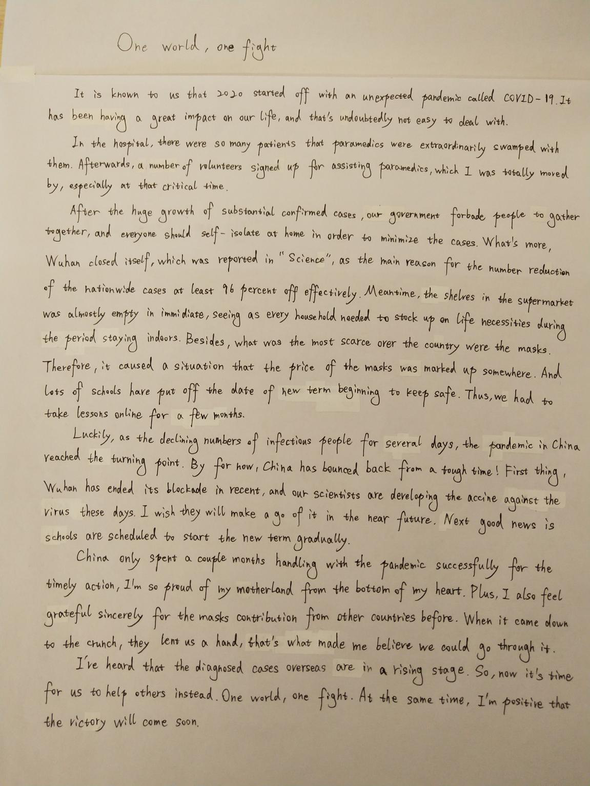 比赛旨在通过英文写作,培养学生关注社会热点、思考生活点滴,用英语抒发观点、表达情感的能力。比赛中收到了学生手写的作文作品二十余篇,学生们阅读了全国人民众志成城、抗击疫情的相关资料,结合个人所见所闻所想进行记叙文续写,评委重点从思维组织、行文结构和语言应用等几个方面进行评价。