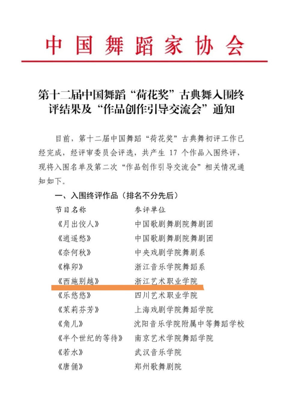 《西施别越》不只是入围了本届“荷花奖”,在过去的一年里,曾入围第12届全国“桃李杯”舞蹈教育教学成果展示活动,参加2019中国(青岛)艺术博览会“芳华杯”艺术教育优秀成果展演,获2019浙江省大学生艺术节乙组一等奖,获2019第二届“浙江风格 江南舞韵”舞蹈作品展演甲组专业类十佳作品。