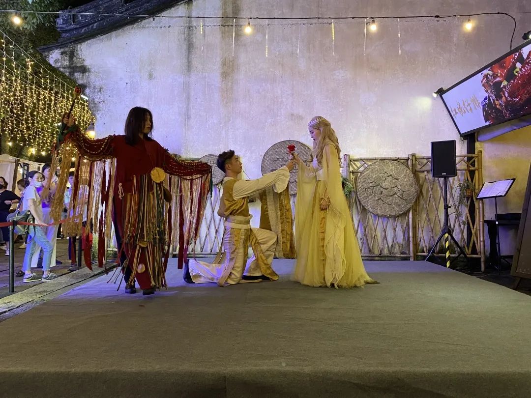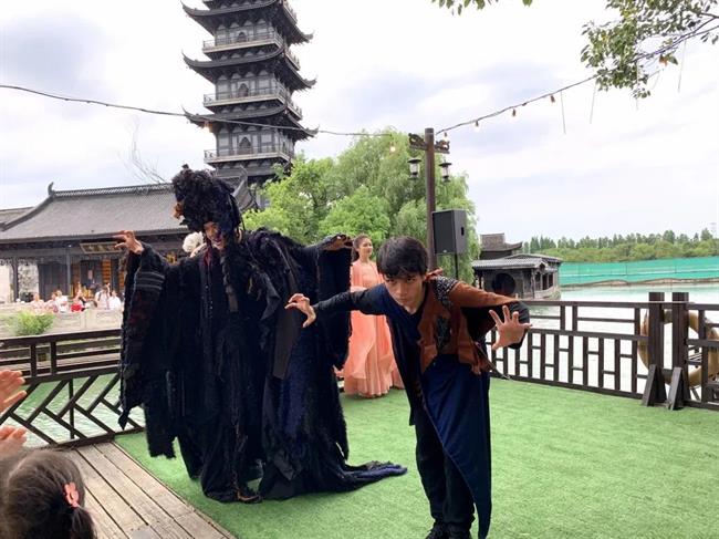 “演绎工坊”暑期文化志愿服务团队的师生们带来了原创肢体情景表演《穿越·梦境》《聊·斋》《梦》,作品中融入戏剧、音乐、舞蹈等多元化艺术元素,令人耳目一新。除情景表演外,“演绎工坊”还根据乌镇景区的要求和观众需求,由戏剧系教师陈丽根据学生们的特长组织创排歌舞表演以及“恐龙”玩偶表演,增强演出效果,观演互动趣味十足,现场观众掌声不断,气氛十分热烈。