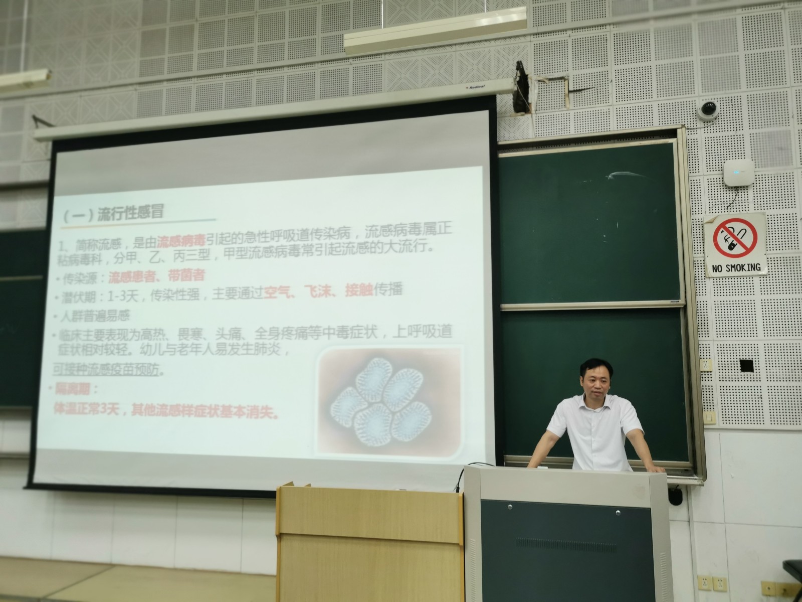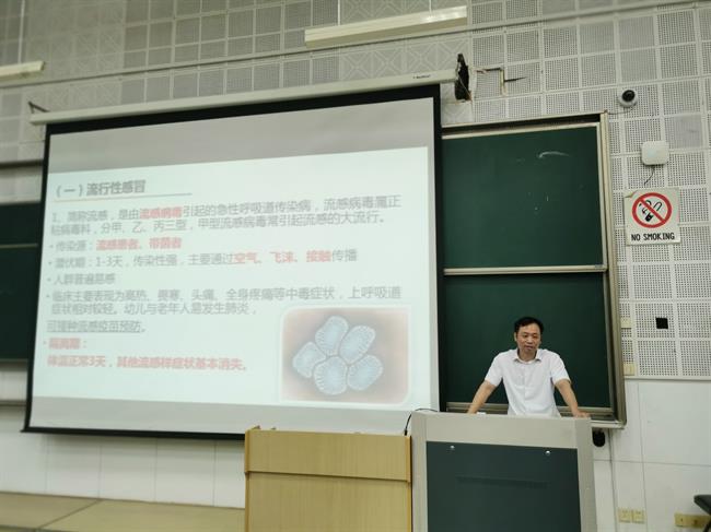 廖震有二十余年的临床内科疾病诊治经验,积累了丰富的流行性疾病防控诊治经验。他通过丰富的视频和图片资料,阐述了秋冬季高发的流行性感冒、水痘、诺如病毒感染、急性出血性结膜炎、肺结核、手足口病、新冠肺炎的发病原理、传播途径和预防措施。告诫同学们勤洗手,勤通风,注意个人卫生习惯,身体不舒服及时与老师联系争取做到早发现,早报告,早处理。