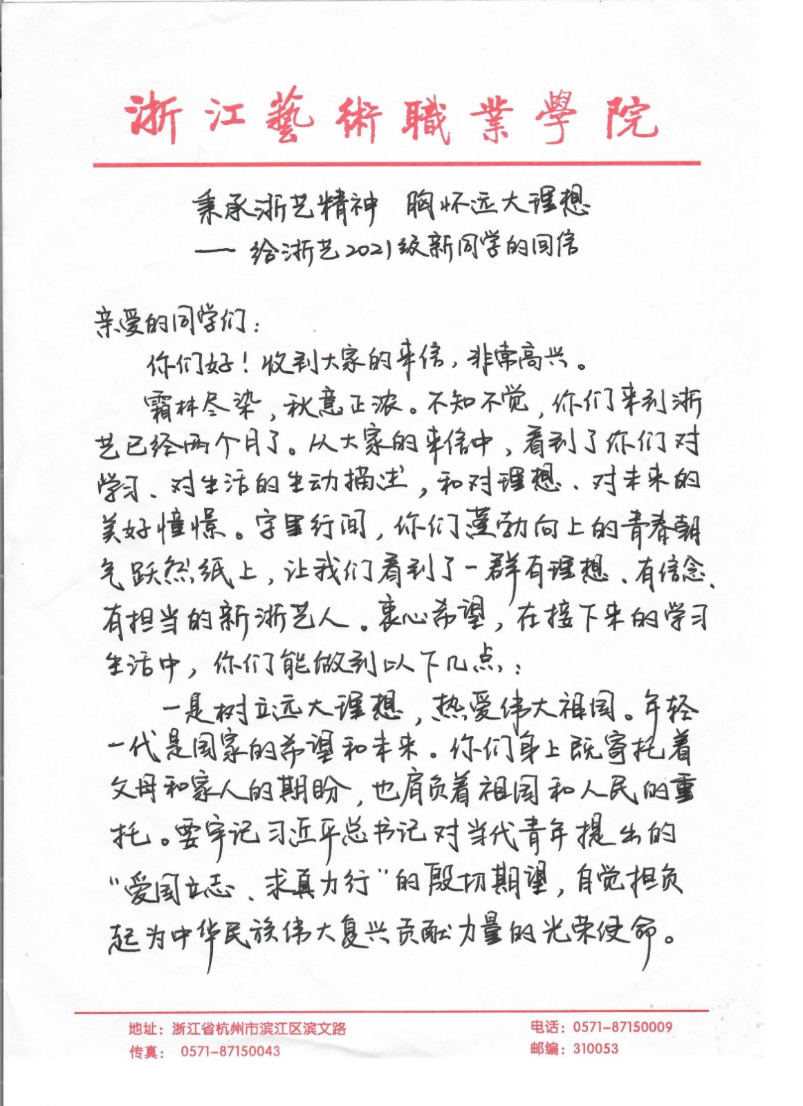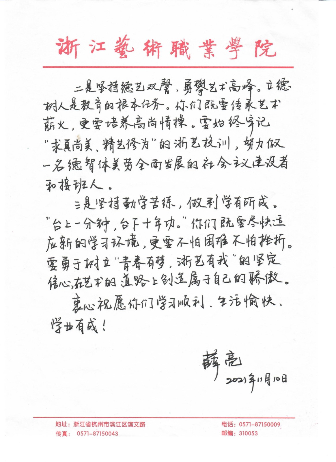 秉承浙艺精神 胸怀远大理想——校党委书记薛亮、院长黄杭娟给全体2021级新生回信