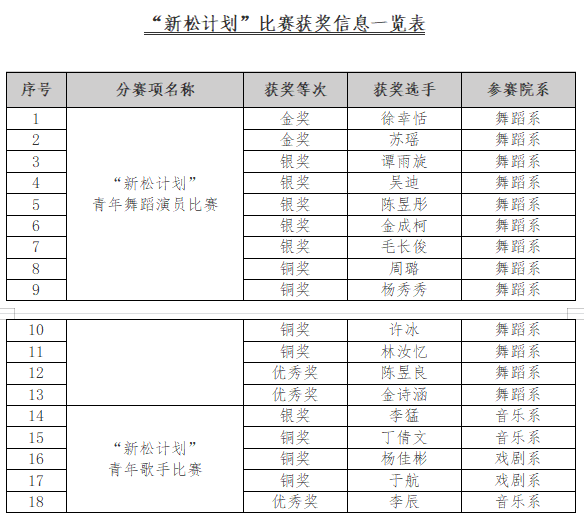 浙艺师生在“新松计划”比赛路上披荆斩棘,载誉归来。2021年“新松计划”比赛设青年歌手和青年舞蹈演员两个项目,我校师表现亮眼,取得了不俗成绩。在本届“新松计划”比赛中共获得2个金奖、6个银奖、7个铜奖、3个优秀奖,获奖数量创历年新高。