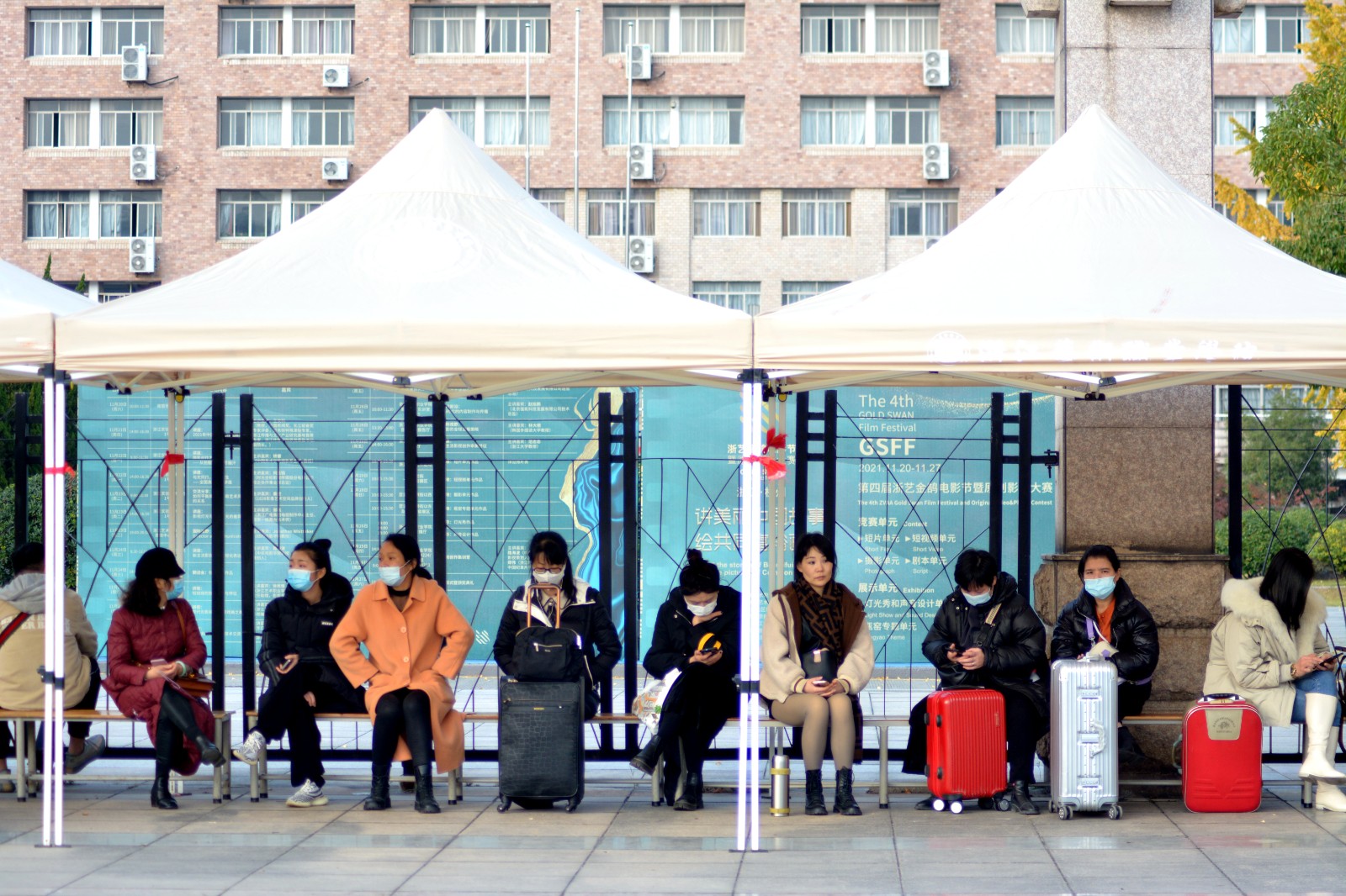 考生们在排队等候时的状态各有不同,或在候考室进行热身,或低头默记曲谱,或在一旁做深呼吸调整情绪。而在校外等候的家长也不轻松,有的家长频频望向校内,有的通过视频电话和其余在家中等候的家人们交流孩子的状况。