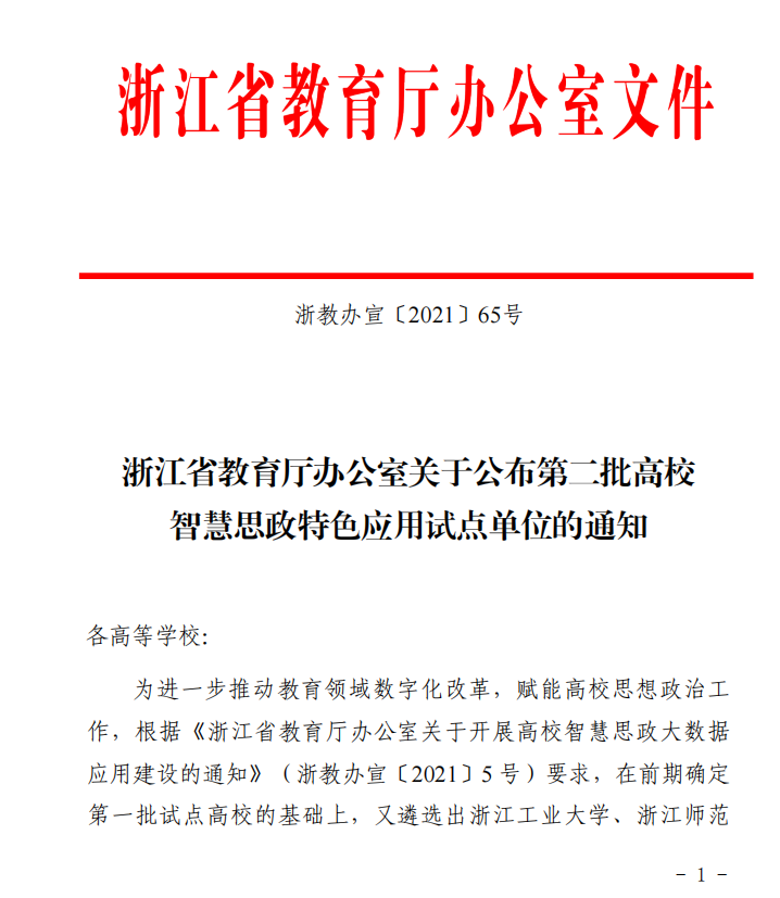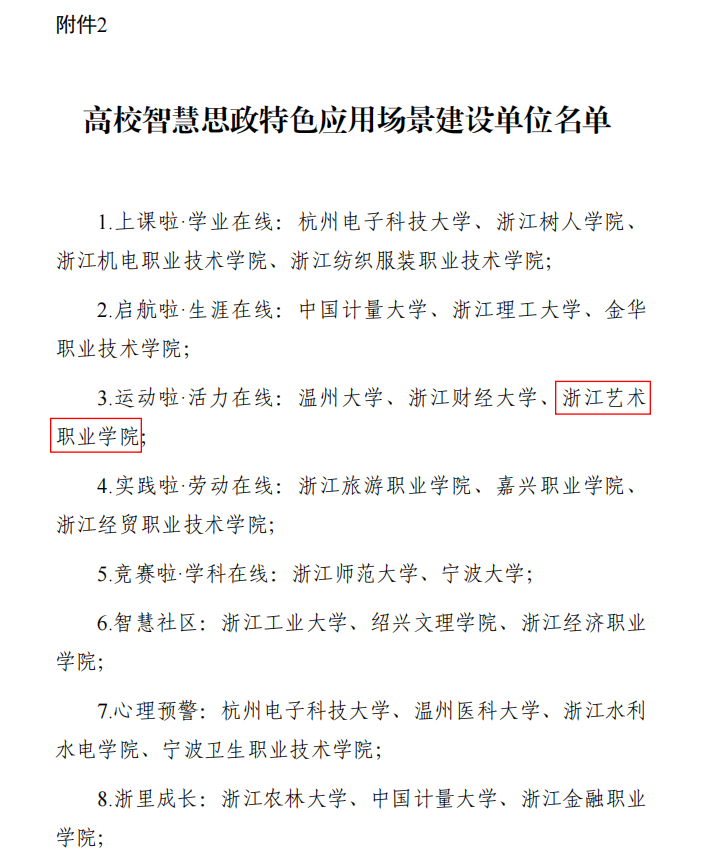 近日,浙江省教育厅公布第二批高校智慧思政特色应用试点单位名单与应用场景建设单位名单,我校成功入选,运动·活力在线被列为高校智慧思政特色应用场景建设单位。此次共有浙江工业大学、浙江师范大学、中国计量大学等15所高校入选试点单位。
