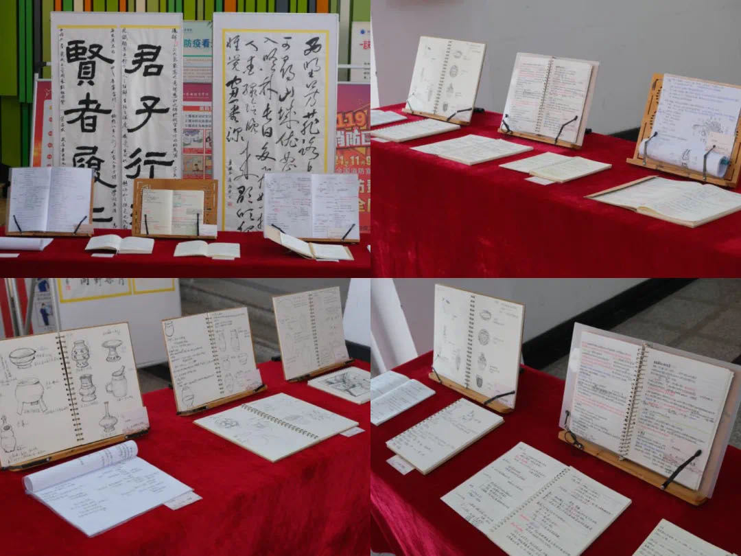 一本本精美丰富的笔记整齐地摆放在展桌上,笔记中工整清晰的字迹,图文并茂的内容,让老师与同学们纷纷驻足欣赏,工作人员们热情亲切地向参观展览的老师与同学们介绍笔记的内容。展出的笔记内容多彩多样,手绘的彩陶图样,形体动作的详细记录,英语语法,文学常识……通过笔记,学生们展现着他们多姿多彩,忙碌而又充实的学习生活,积极向上,一丝不苟的学习态度。