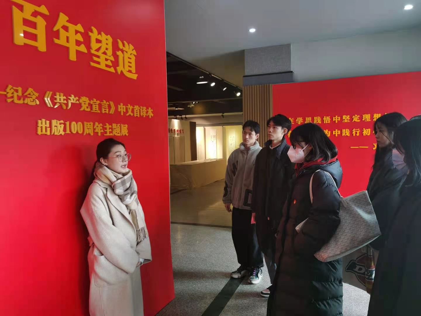 随后,全体党员、部分入党积极分子及36期党校学员前往美术系参观“百年望道”——纪念《共产党宣言》中文首译本出版100周年主题展。在美术系孙梦悦同学的讲解下,大家全面了解《共产党宣言》的写作背景、主要内容、本质特征和当代价值,陈望道的生平及早年翻译《共产党宣言》的经历,再现了马克思主义走进中国,一百年前中国的先进知识分子对“真理味道”不懈追寻的画面。大家还参观了美术系学生设计的主题海报、全校100位师生手抄的《共产党宣言》等精彩作品。