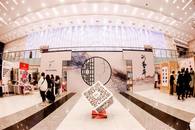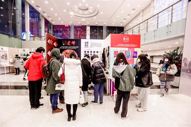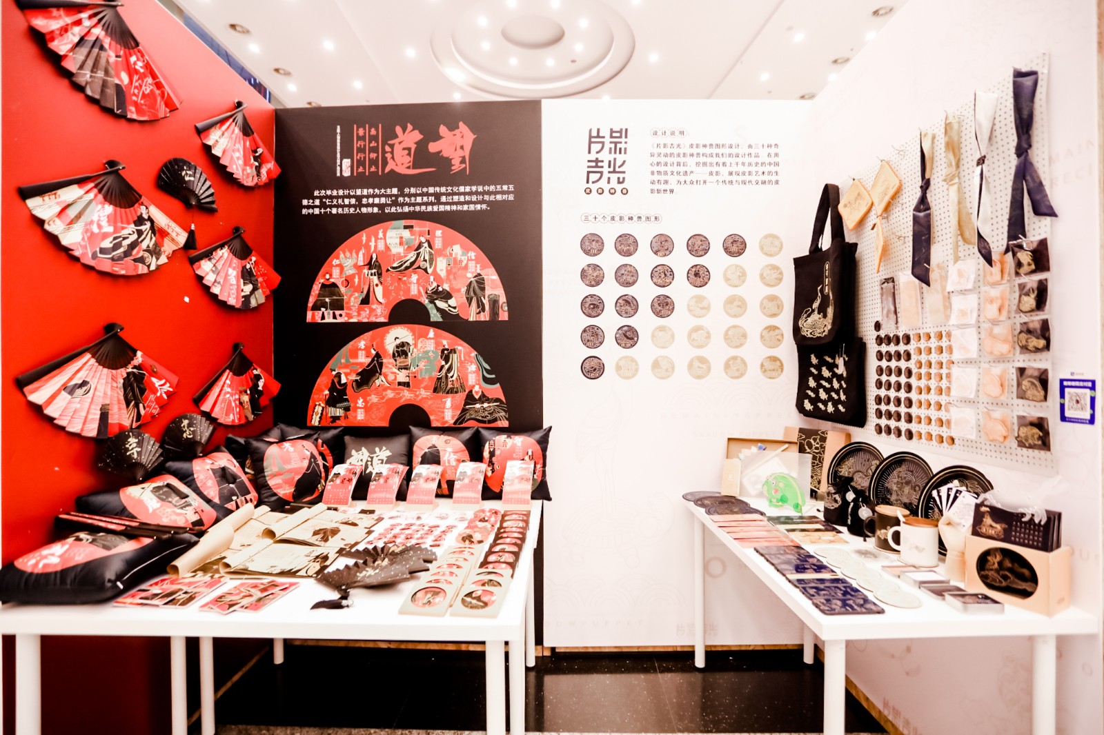 开演前,浙艺师生还在杭州剧院大厅布置了“创意市集”,作为美术系传·融2021届毕业设计作品展的活动内容之一,展品是由广告设计与制作专业、动漫设计专业和环境艺术设计专业学生设计并制作的创意作品。作品在主题上侧重对中国传统文化、传统技艺的继承、发扬和创新。有体现孝道文化的《孝行》、体现儒家思想的五常五德“仁义礼智信、忠孝廉勇和”的《望道》;有表现非遗技艺的《缬艺》蓝夹缬视觉化创衍、皮影技艺《片影吉光》;有从建筑榫卯结构上进行创新应用的《丁壹卯贰》和演绎传统越剧服饰图案的《越语等,在国际化和全球化的趋势下,学生们回归历史与本我,结合传统与现代,将民族气质、精神和理念融入设计作品中,不断探索与创新,不断传承与融合。