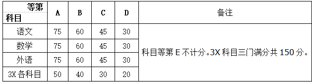 学业水平考试成绩由语文、数学、外语三门中任选两门最优等第科目3X科目五门科目成绩组成。3X科目是除语文、数学、外语外,另7门学业水平考试科目中任选三门最优等第科目。往届生的技术科目成绩由通用技术和信息技术两科成绩中选最优科目等第计入总分。具体成绩折算方法如下: