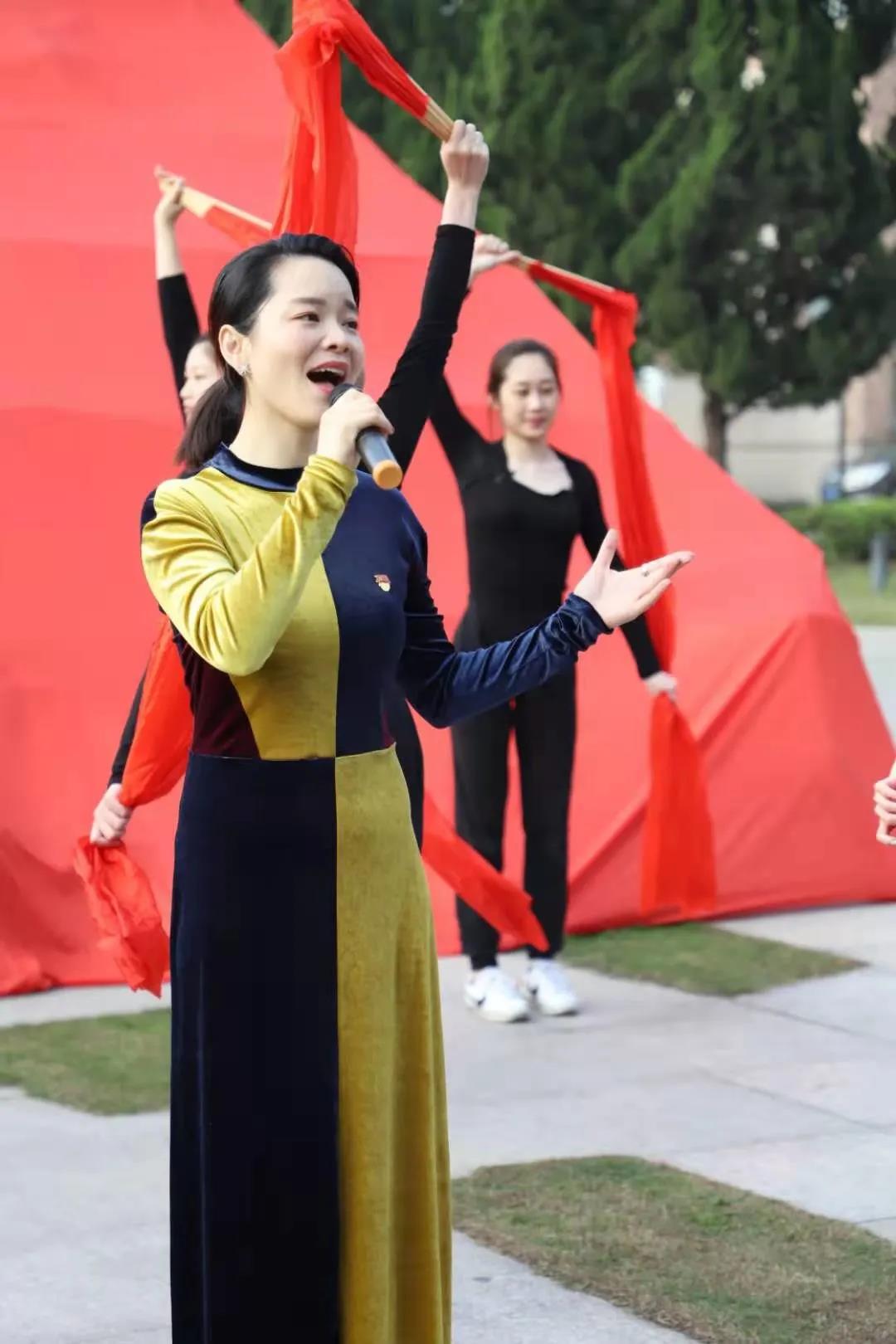 校国旗护卫队的同学,拿着鲜艳的国旗,正步走向国旗台。当熟悉的《义勇军进行曲》奏响,国旗护卫队的旗手将国旗抛向空中,五星红旗迎风飘扬,“起来!不愿做奴隶的人们……”同学们齐声唱响国歌。青年党员教师钱思舒用歌声为建党百年献礼。国家奖学金获得者、2018级歌舞班冯一骐同学领誓。