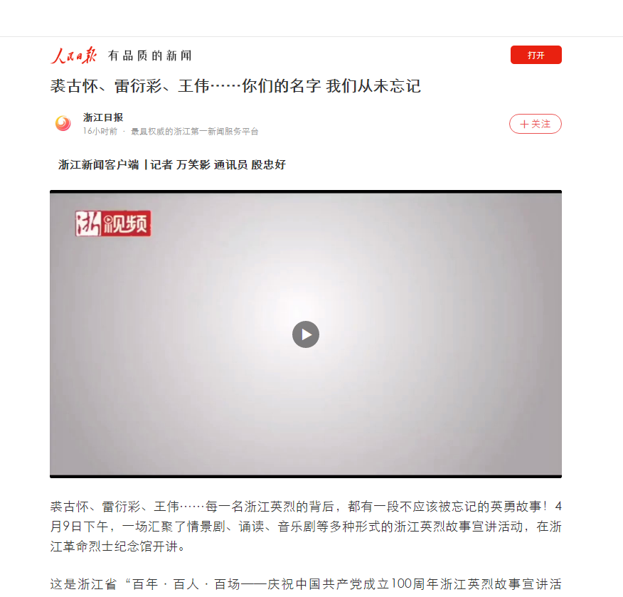裘古怀、雷衍彩、王伟……每一名浙江英烈的背后,都有一段不应该被忘记的英勇故事!4月9日下午,一场汇聚了情景剧、诵读、音乐剧等多种形式的浙江英烈故事宣讲活动,在浙江革命烈士纪念馆开讲。