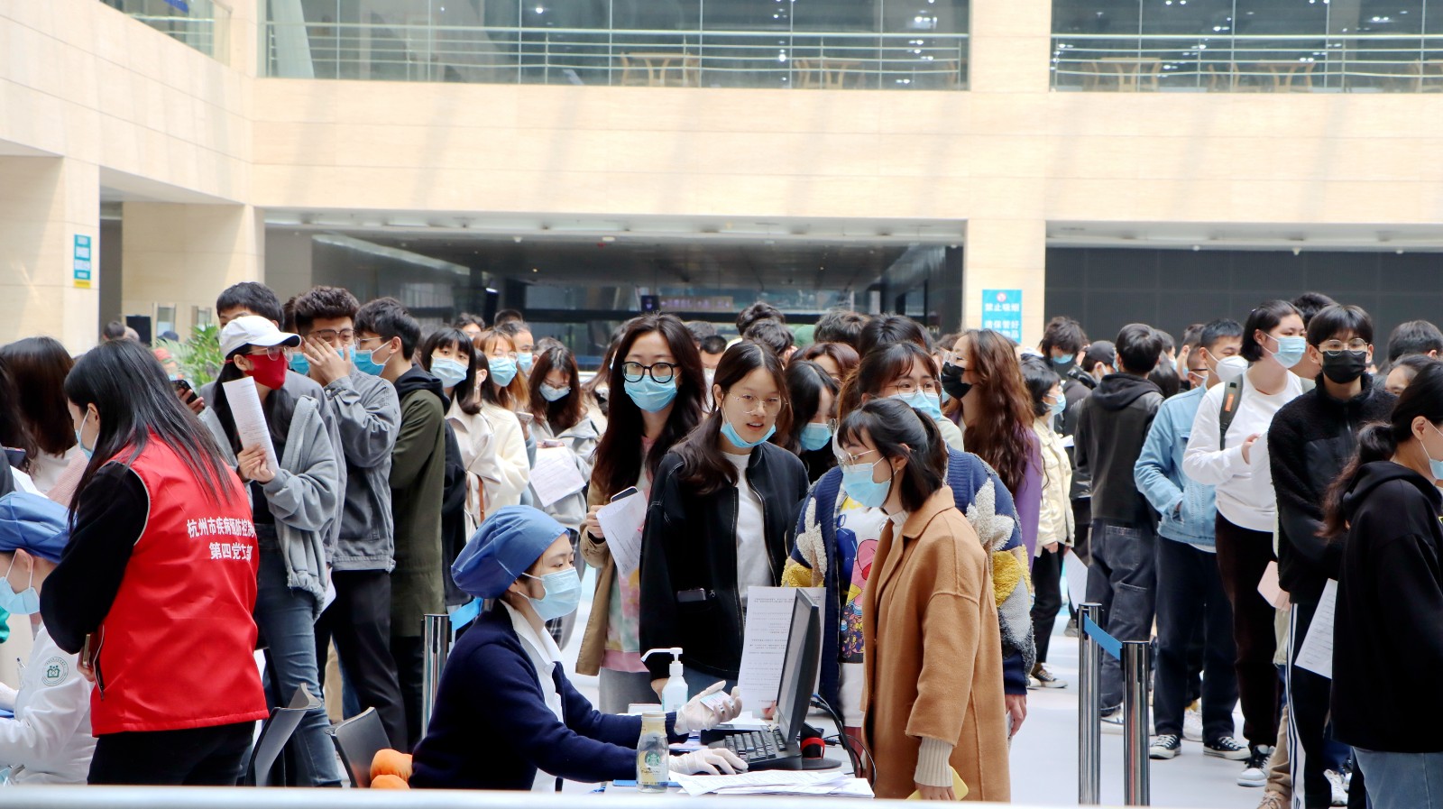 继4月9日第一批浙艺师生接种疫苗后,今天,全校各系师生、职能部门教职工分批来到滨江区浦沿街道卫生服务中心方舱临时接种点接种疫苗。