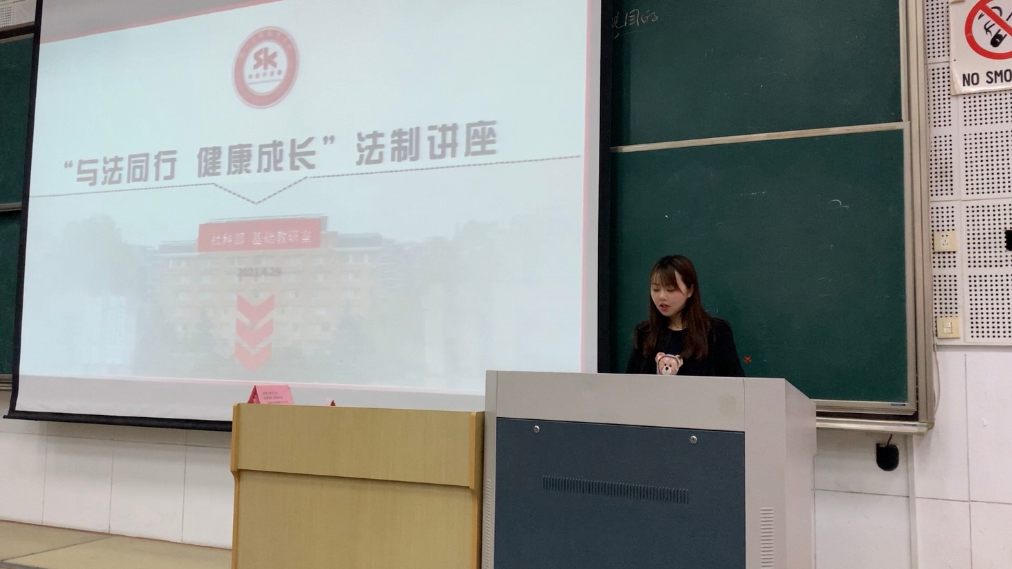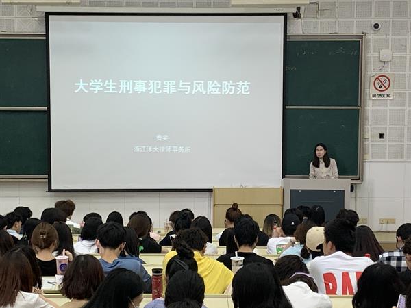 为培养学生法治思维,提升法治素养,提高学生知法、懂法、守法、用法的能力,4月29日下午,社会科学部在校阶梯二教室举办“与法同行  健康成长”法制讲座。浙江泽大律师事务所二级合伙人金文超、费斐两位优秀律师为思政理论课15个教学班级、600余名同学带来了一堂生动鲜活的“法治课”。