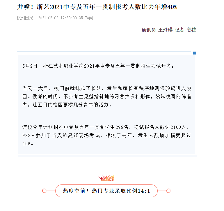 杭州日报:井喷!浙艺2021中专及五年一贯制报考人数比去年增40%