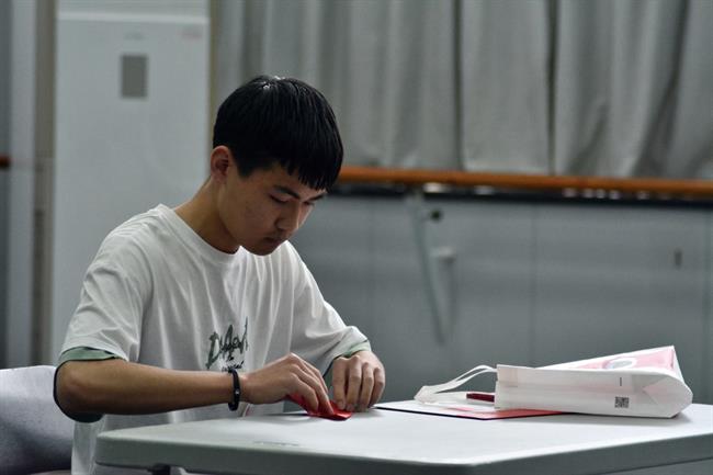 专业测试时,考生按地区分组由学生志愿者井然有序带入考场。考生使出浑身解数,力图将自己最好的一面展现出来。有人弹古筝、有人吹葫芦丝、有人吹笙;有人演唱戏曲,有人唱美声;有人展示拉丁舞,也有人跳武术操……表演形式众多,跨度很大。在候考教室内的考生则为考试做着最后的努力,有的站在窗前开嗓,有的在仔细检查乐器,也有考生坐在地上穿戴表演服饰。一位身着藏袍的男生腼腆地说,从专业老师那儿了解到相关招生信息,所以想要报考浙艺,作为应届舞蹈艺考生对这次考试心中有把握。