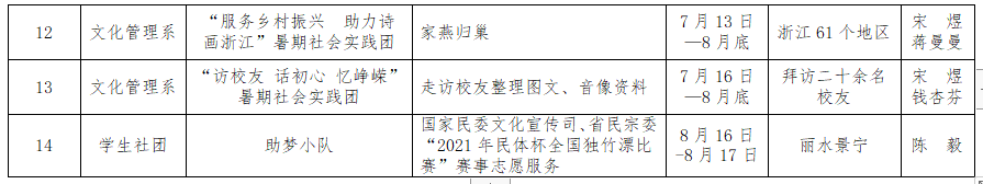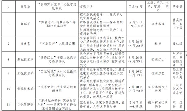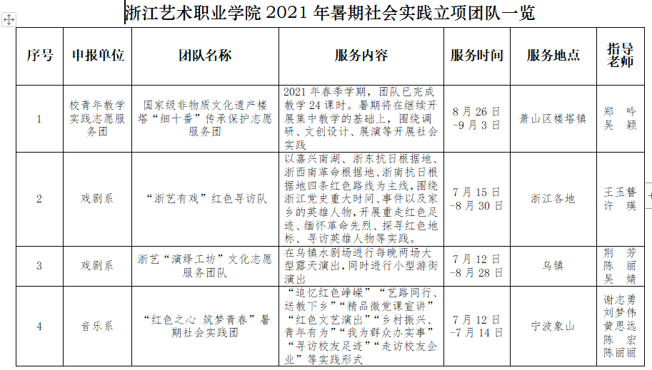 经各院系申报,校青年教学实践志愿服务团国家级非物质文化遗产楼塔“细十番”传承保护志愿服务团;戏剧系“浙艺有戏”红色寻访小队、“演绎工坊”文化志愿服务团队;音乐系“红色之心 筑梦青春”暑期社会实践团、“我的声乐党课”文化志愿服务队;舞蹈系“舞者丹心 逐梦百年”暑期社会实践团;美术系“艺美前行”志愿服务团;影视技术系“锦绣江山”非遗文化保护志愿服务队、“艺光映像”乡村文化振兴志愿服务队、“追寻荣光”党史学习教育调研团;文化管理系“赓续红色精神 筑梦美丽乡村”——浙艺手艺走进余东村暑期社会实践团、“服务乡村振兴  助力诗画浙江”暑期社会实践团、“访校友 话初心 忆峥嵘”暑期社会实践团;学生社团“助梦小队”等14支团队400余名师生将赴全省各地开展实践工作,引导青年师生深入基层一线受教育、长才干、作贡献,读好“无字之书”,展现浙艺风采。