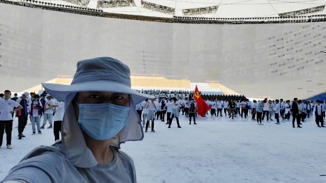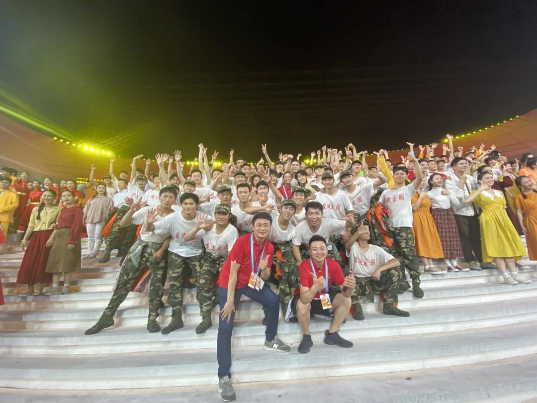 曹晨霄:对这次演出最大的感受首先是史诗级的恢宏制作。本次演出在国家体育场(鸟巢)进行,舞台非常巨大,占据了整个赛场场地,背景LED屏也占据了鸟巢一半的观众席区域。总演职人员超过一万人。服装道具数万件,并且邀请了解放军三军仪仗队,以及国内大部分知名艺术家共同演绎;其次是历时最长,从核心主创团队策划开始到最后的排练演出历时两年以上;第三是过程艰辛、管理严格。此次演出集中排练阶段,文旅部在北京郊外的昌平阅兵村搭建了同等比例的模拟舞台,四月份开始,所有演职人员便在此全封闭管理,顶着风吹日晒,夜以继日地排练节目,强度最大的时候,将近一个月每天排练9小时。目前国内疫情形势依然不容松懈,从五月中旬开始,排练管理更加严格,每人三天一次核酸检测,有中风险地区行程史人员全部隔离14天;最后就是演出的艺术创作层面非常严谨,几乎每个作品都是数易其稿,尤其是最后审查阶段更是多个节目通宵修改调整,也正是这样的专业态度,才能最后呈现出一台高水准的节目。 Q 此次演出给您留下最深刻的印象是什么? 曹晨霄:印象最深刻的是我这次参与创排的《党旗在我心中》这个节目。在6月25号带观众演出的那一场,到这个节目的时候,天空突然下起了暴雨。这个节目表现的正是2008年汶川地震“抗震救灾”的主题,暴雨的效果非常吻合当时紧急救援的节目气氛,使得这个作品更加生动,极具艺术效果。尤其中间慢板部分,党旗在人群中缓缓升起和所有战士高喊“中国加油!”时,全体观众报以热烈的欢呼和掌声,将整个节目推向高潮。后来,央视拍摄组也觉得暴雨的效果非常符合这个节目的主题,因此,将那天演出的部分片段剪辑到了最后央视一套播出的版本中,这个节目现场的暴雨是不是特效的话题还上了各大排行榜热搜,其实完全是上天给这个节目馈赠的“惊喜”。(笑) Q 参与此次演出的最大收获是什么? 曹晨霄:此次演出最大的收获首先是和全国的顶尖艺术家们一起共同完成了这次演出任务,为我们党的百年华诞庆生。看到了众多艺术家的精彩创意和表演风采,也学习了更多舞台艺术形式和多媒体结合呈现的艺术效果。其次在这次演出的排练过程中,文旅部还组织了多次的党员活动。导演和演员团队分批观摩了党史宣传片,邀请了多位全国优秀讲解员进行了党史演讲,在整个过程中,我们都学到了丰富的党史知识,也对中国共产党在新时期带领全国人民奋斗的多个伟大事迹有了更加深刻地了解。 Q 通过这次参演,您想对我们浙艺的同学说点什么? 曹晨霄:这次演出排练过程中,我看到了很多全国其他艺术院校的参演团队,应该说每支团队都有各自的特点和优势,都有值得我们学习的地方。我希望我们浙艺的同学首先要拥有良好的专业素质,第二要拥有敬业的工作态度,其次要学习更多丰富的专业知识,在今后的学习中有机会能参与更多的专业实践,拓展视野。只有具备更高水准和更加全面的能力,才能在今后的就业竞争中具有更大的优势。另外,这次的演出中,有不少浙艺校友参与,包括中国舞协副主席山翀老师,东方演艺集团国家一级演员殷硕老师。还有近几年考入北京舞蹈学院的舞蹈系同学们,他们都是我们的骄傲。希望浙艺走出的学子能有更多参与国家重大演出实践的机会,也希望浙艺能培养出更多的优秀艺术家。