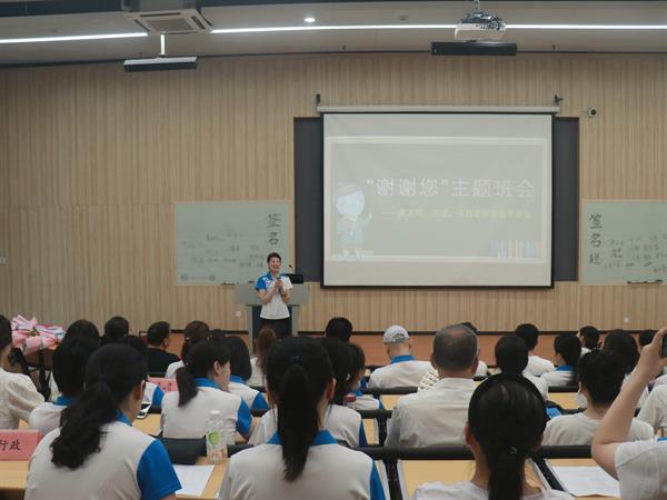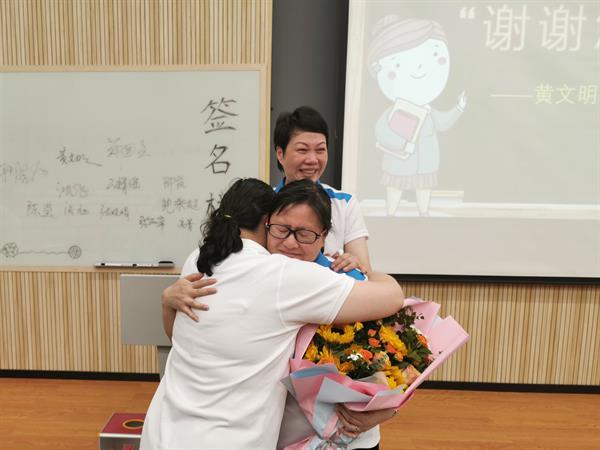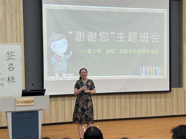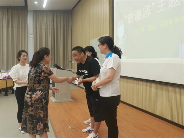 荣退仪式以师生们熟悉的“主题班会”形式进行,主题为“谢谢您”。伴随着《听我说谢谢你》的背景音乐,步入教室的老师们在签名墙上写下了自己的名字,共同绘制基础教学部的大名片。“班主任”郑园全主持“班会”。她感谢三位退休教师为基础教学部的发展奠定了良好的基础。她说,以教师职业为荣,以教育事业为重,倾全部心血教书育人,孜孜不倦耕耘讲坛。基础部的一点一滴都记载着您们教育事业的功劳,学校的一草一木都浸润着您们孜孜求索的深情。在您们身上,我们学到了任劳任怨、精益求精的敬业精神,学到了真诚坦荡、为人师表的待人哲理。