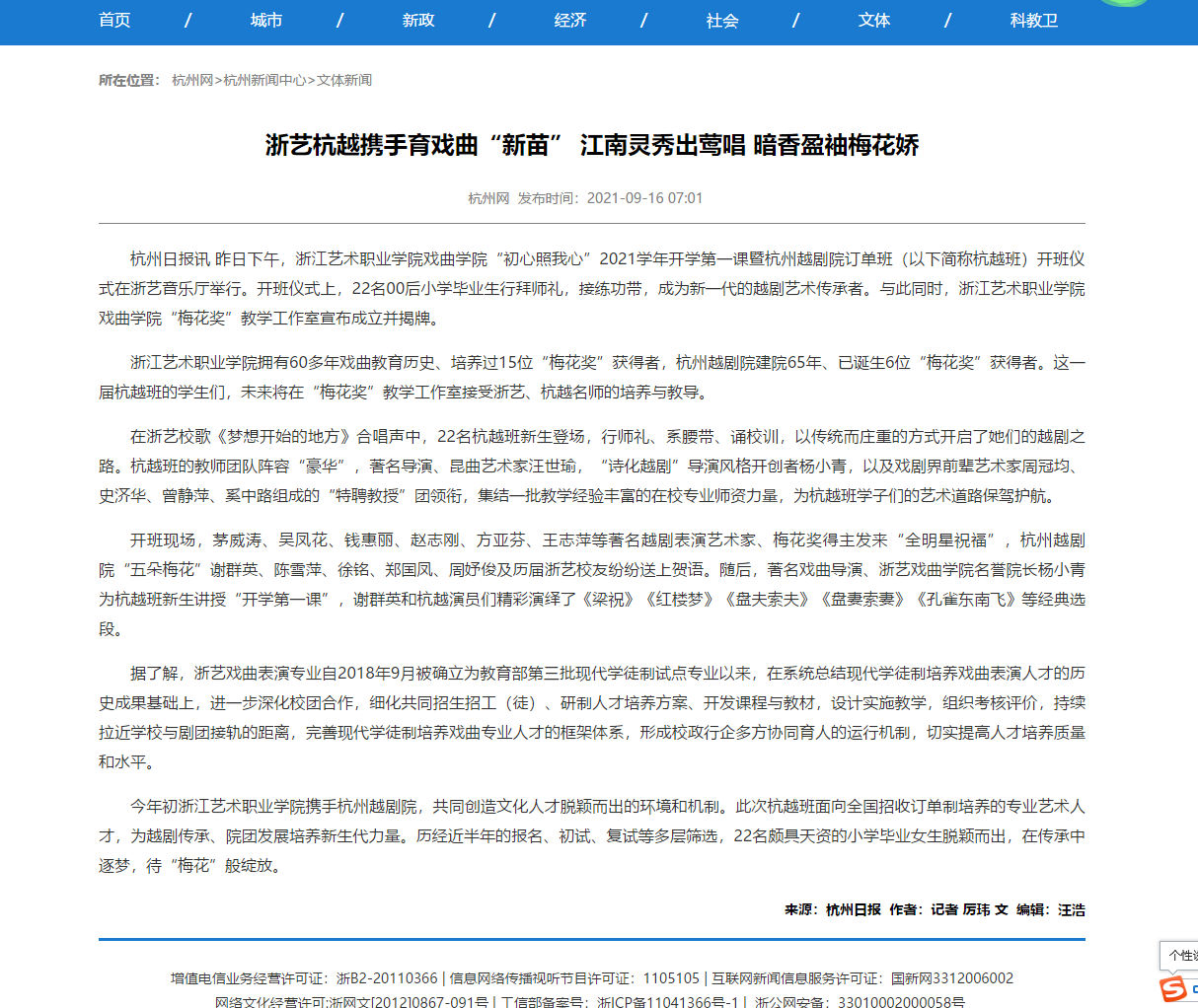 杭州日报:浙艺杭越携手育戏曲“新苗” 江南灵秀出莺唱 暗香盈袖梅花娇