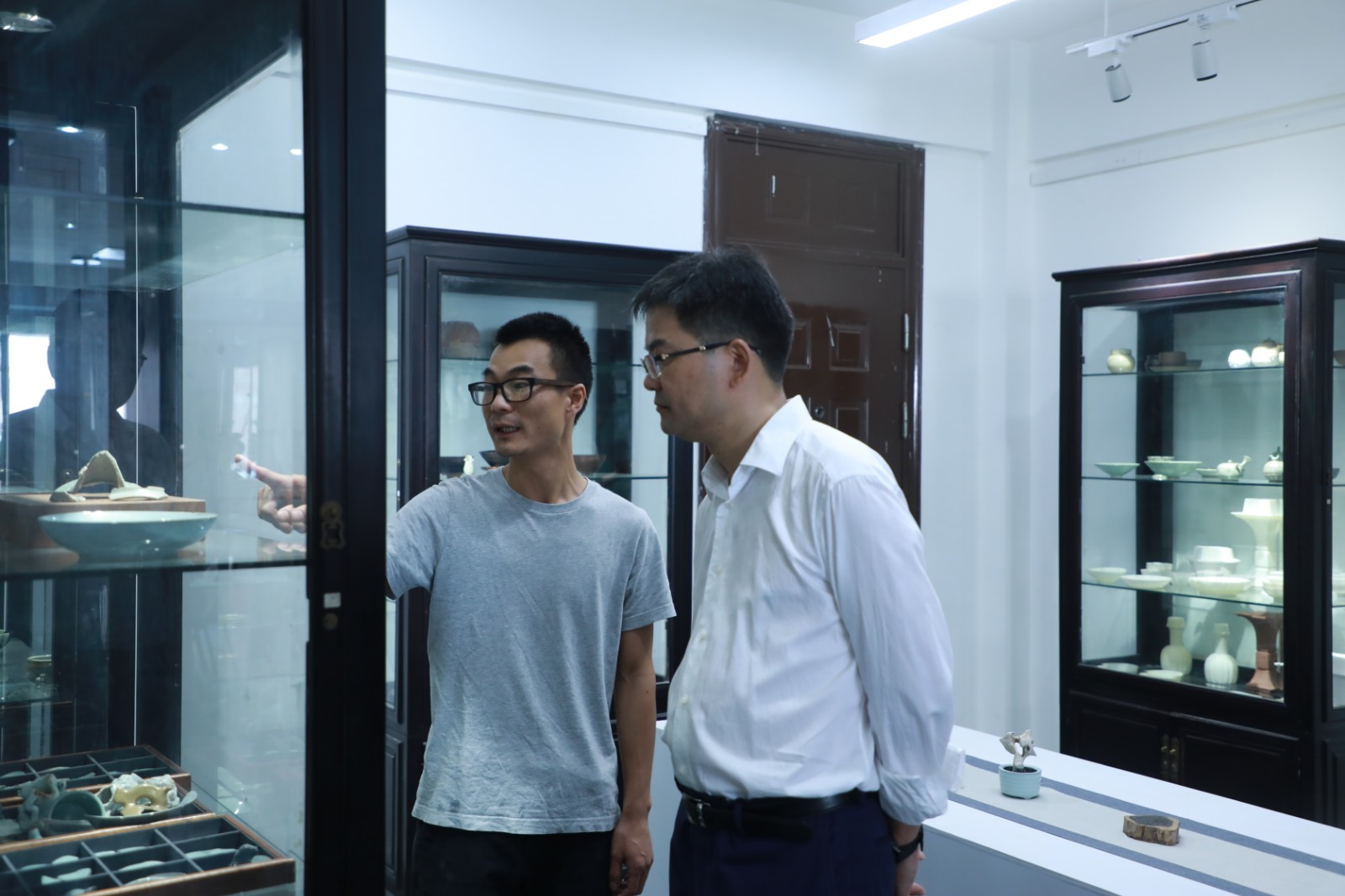 李志龙一行参观了国家“双高”专业群领衔专业戏曲表演专业教学场地、中央财政支持重点建设专业文物修复专业实训室等。在走访慰问,李志龙向老师们送上了问候;在陶艺实训室,与我校文物修复与保护专业教师进行深入交流。他肯定了浙艺的教学水平和取得的教学成果,代表滨江区我校全体教职工致以节日的问候,对学校的办学理念、人才培养、教育教学等方面给予了充分肯定。李志龙对学校为高新区(滨江)的发展建设所发挥的作用表示感谢,并希望学校能够继续发挥学科人才优势和社会服务功能,积极参与高新区(滨江)建设,推动全区教育事业发展再上新台阶。