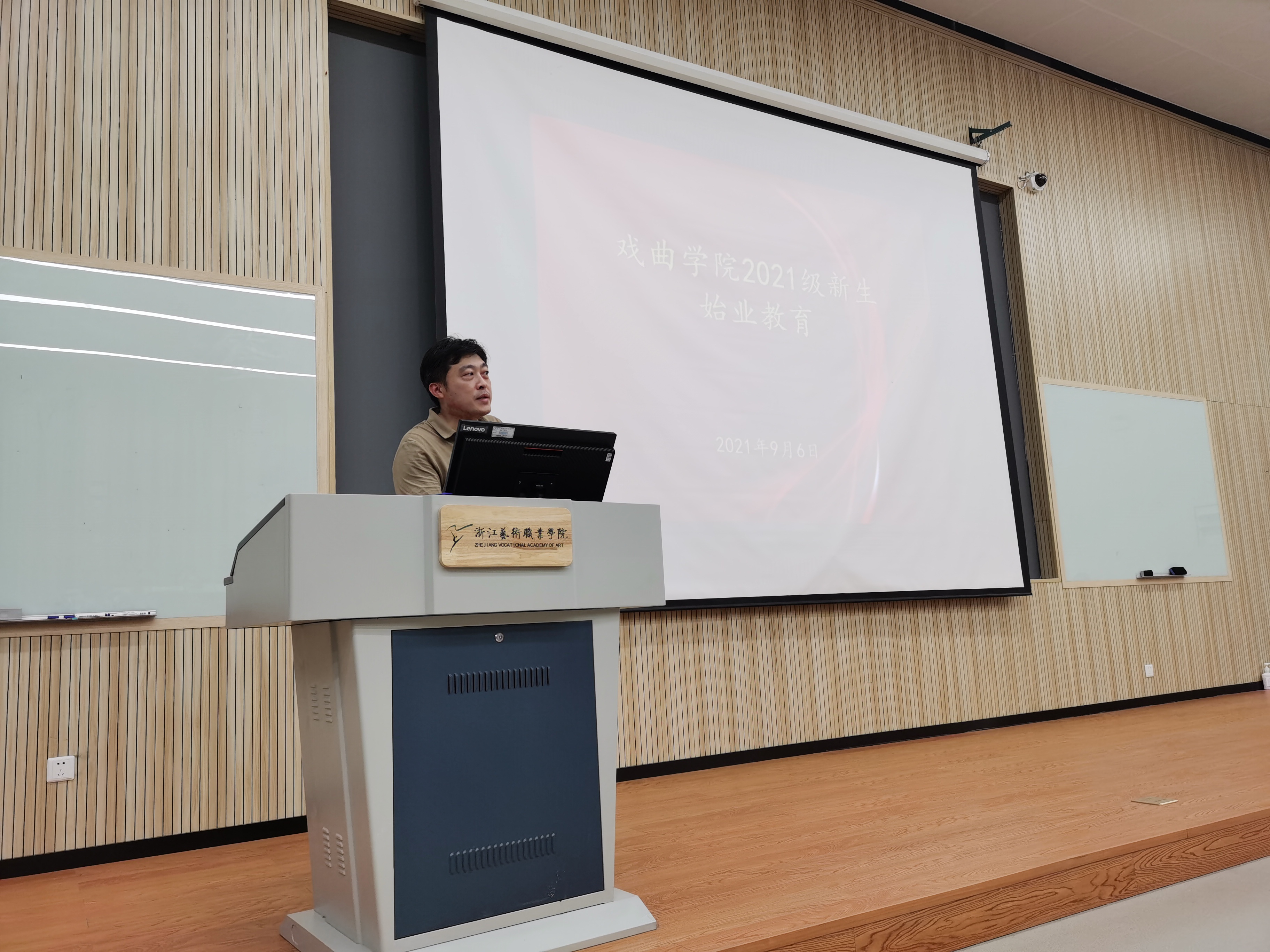 9月6日晚,戏曲学院2021级新生始业教育在阶梯教室举行。戏曲学院党总支书记谢青、副院长周伟君、专职副书记杨晓浤,以及辅导员、班主任和各班新生参加活动。