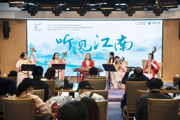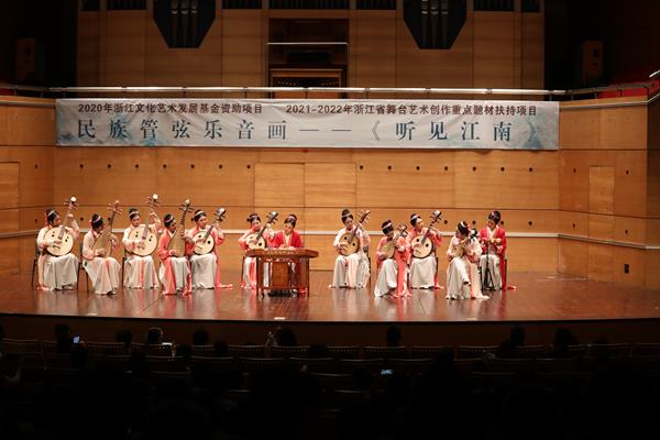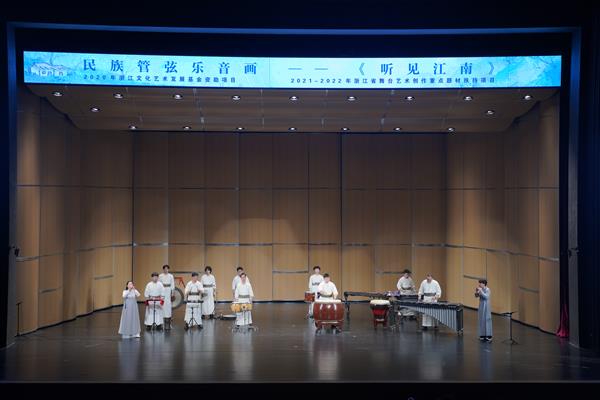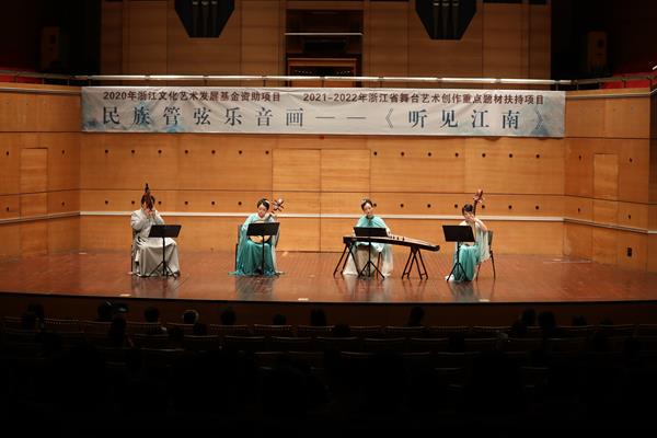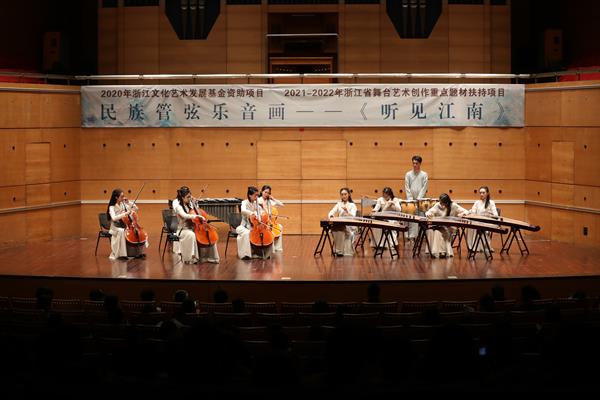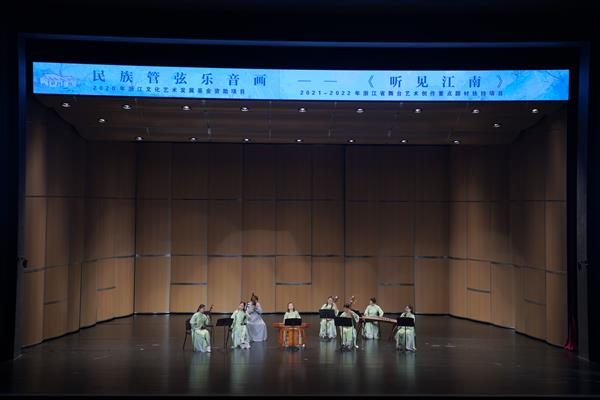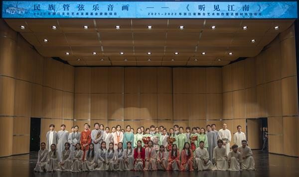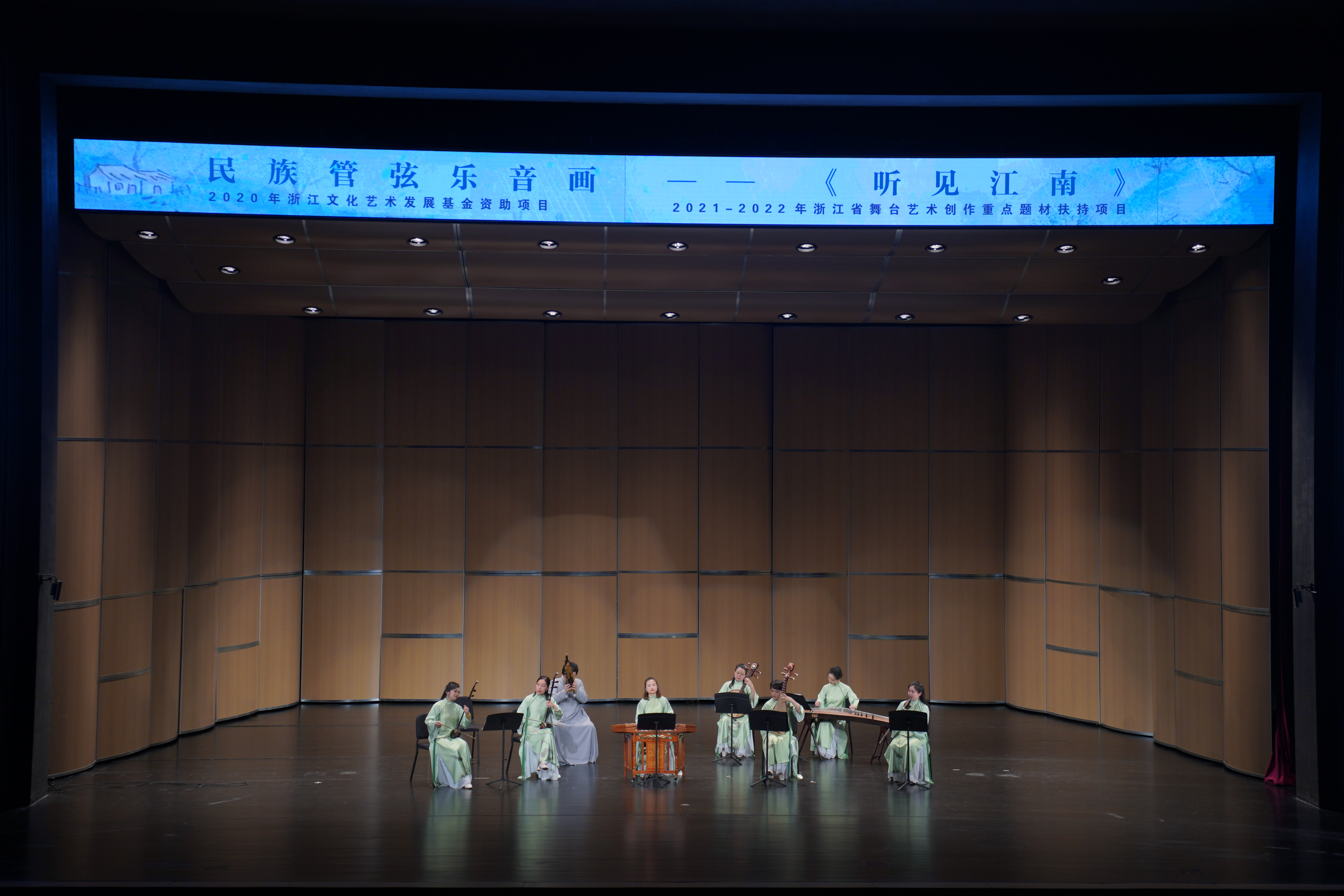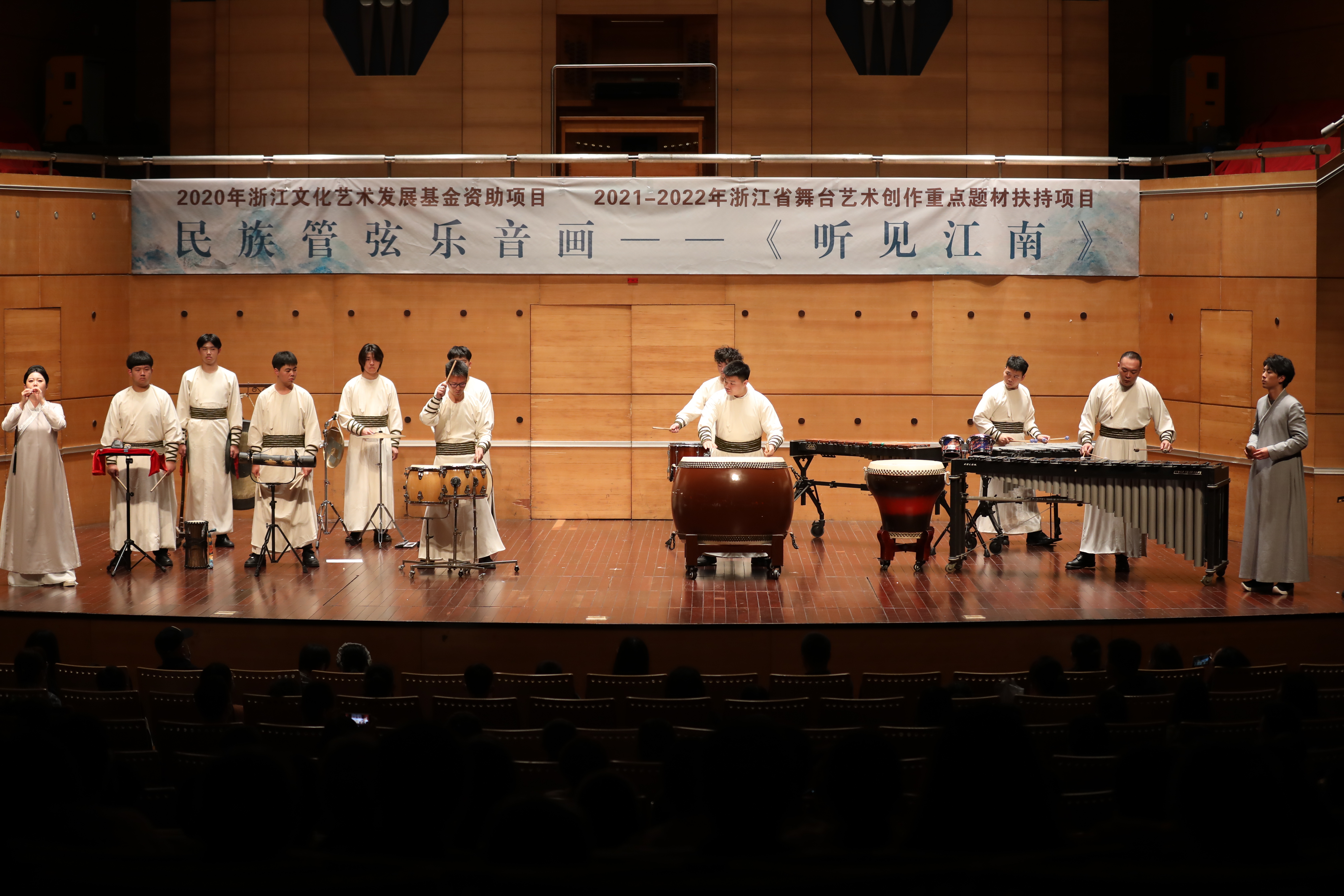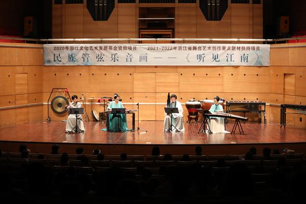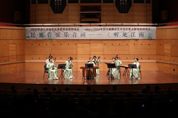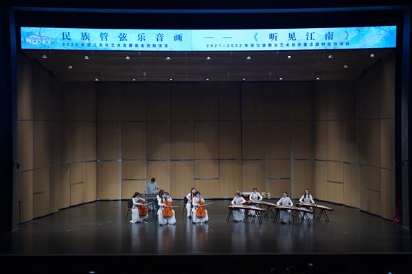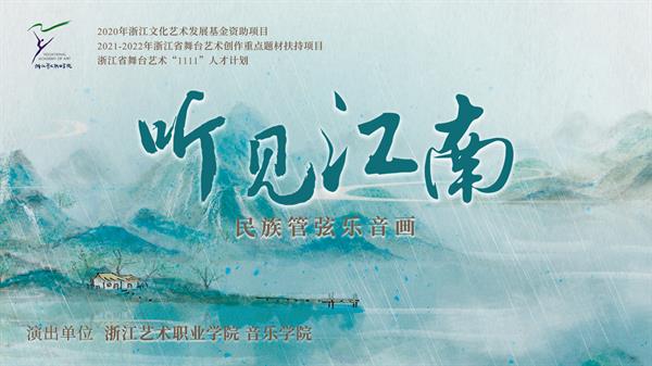 民族管弦乐音画《听见江南》为2020年浙江文化艺术发展基金资助项目、2021-2022年浙江省舞台艺术创作重点题材扶持项目,2022年1月于浙江实验艺术剧场首演。2022年春节期间,中国驻纽约总领馆举办“欢乐春节”活动,通过其微信公众号平台向广大海外观众分享《听见江南》的精彩演出视频,广受好评。9月底,浙艺音乐学院师生在杭州武林银泰街区露天演绎《听见江南》经典曲目,以文艺志愿者身份倾情助力浙江“文艺星火赋美工程”启动仪式。接下来,《听见江南》还将继续开展不同形式的巡演,敬请关注。