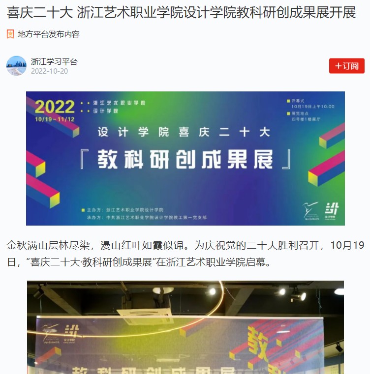 黄杭娟在致辞中表示:“很高兴看到设计学院以展览的形式呈现教科研创成果,体现了设计学院教师团队勇于创新、锐意进取的精神风貌,也为学校厚植艺术职业教育浓厚学术氛围提供了样板。设计学院全体师生要全面总结过往经验,守正创新、踔厉奋发,秉承立德树人初心,更好地肩负起在教科研创、社会服务等方面的重要使命,更好地发挥在提升教育教学水平、繁荣哲学社会科学等方面的积极作用,在第二个百年奋斗目标的新征程上为开创艺术教育与科研创新的新篇章作出更大贡献。”