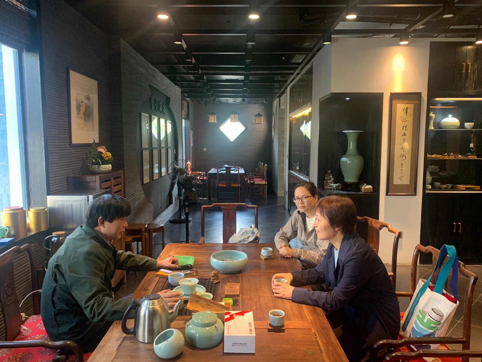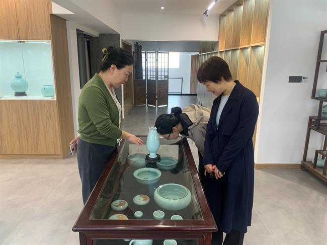 随后,金银琴一行到了青子瓷艺,这也是学校的校企合作实践基地。陈少青介绍了青子瓷艺工作室是以开发青瓷艺术瓷,精致实用瓷为主要经营思路,在继承传统工艺基础上推陈出新,力求把每件作品都以精湛的工艺手法与美术相结合,尽可能烧制出独特而具有艺术魅力的作品。参观之余,双方也希望保持、深化合作,共同开展技艺传授和实践教学。同时,陈少青老师曾经与学校开展的非遗研培成果也将在近期即将推出的手工艺教学成果展中展出。