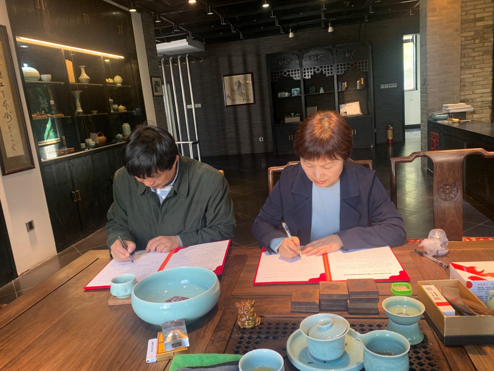 “子芦瓷坊”由中国陶瓷艺术大师卢伟孙于1997年立窑烧制。子芦瓷坊秉承宋瓷瓷韵,致力于传统龙泉青瓷的发掘和制作,同时赋予产品更多的审美情趣,格调高雅,制作精良。卢伟孙向金银琴一行介绍了作品的艺术创作理念、制作技艺过程。金银琴介绍了学院专业的发展情况,希望能够与卢伟孙老师开展深度合作,在子芦瓷坊建立产教融合教学实践基地,期待卢伟孙能指导民族传统技艺专业建设和教学,共同为非遗技艺传承创新育人育才。双方经过交流,达成了一致目标,签署了合作协议。