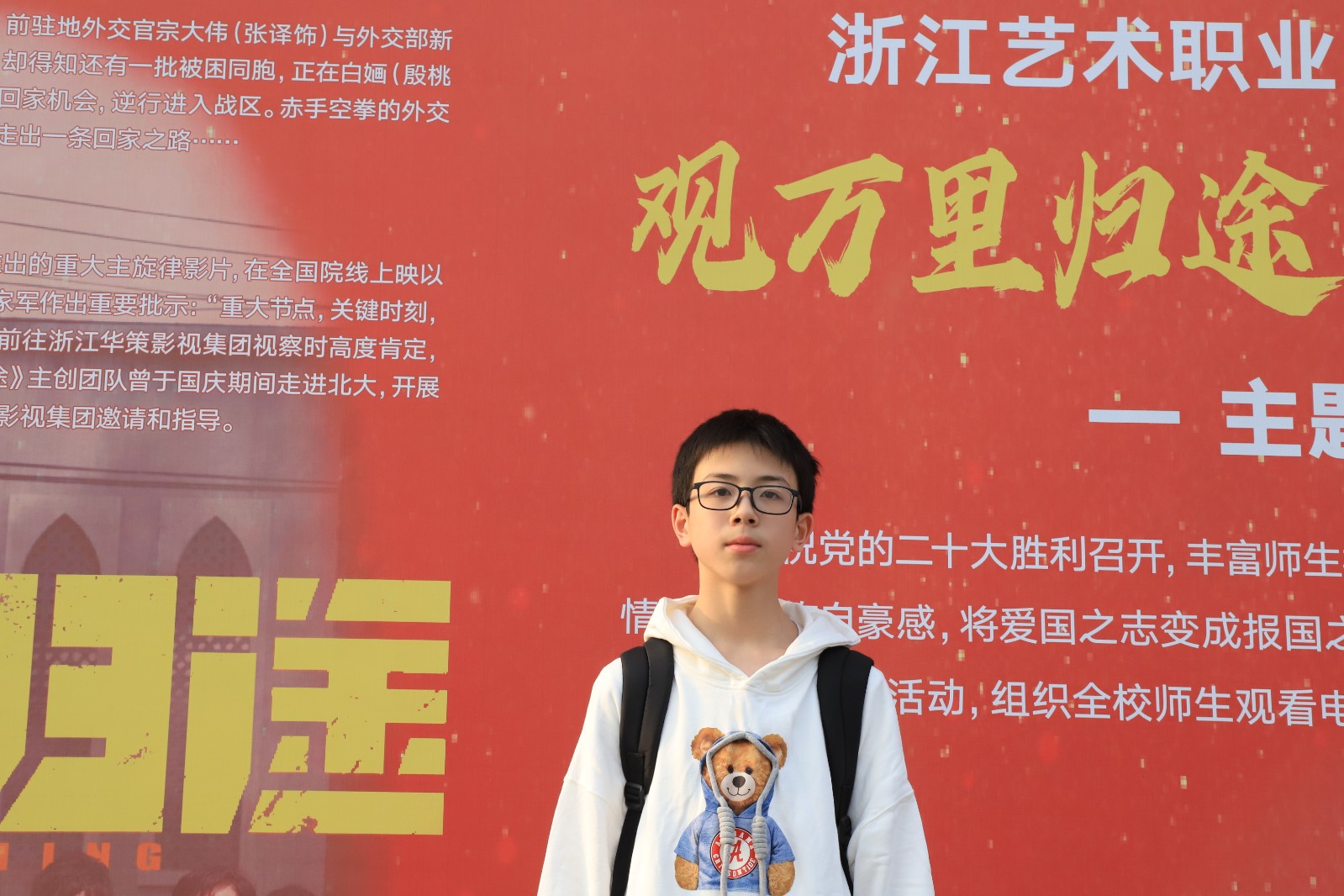 舞蹈学院2020级小舞班学生陈杭嘉说:“看到影片中中国同胞回国的那一刻令我印象深刻。这部电影让我看到了中国外交官的艰辛和不易。今后要好好学习,为祖国效力。”
