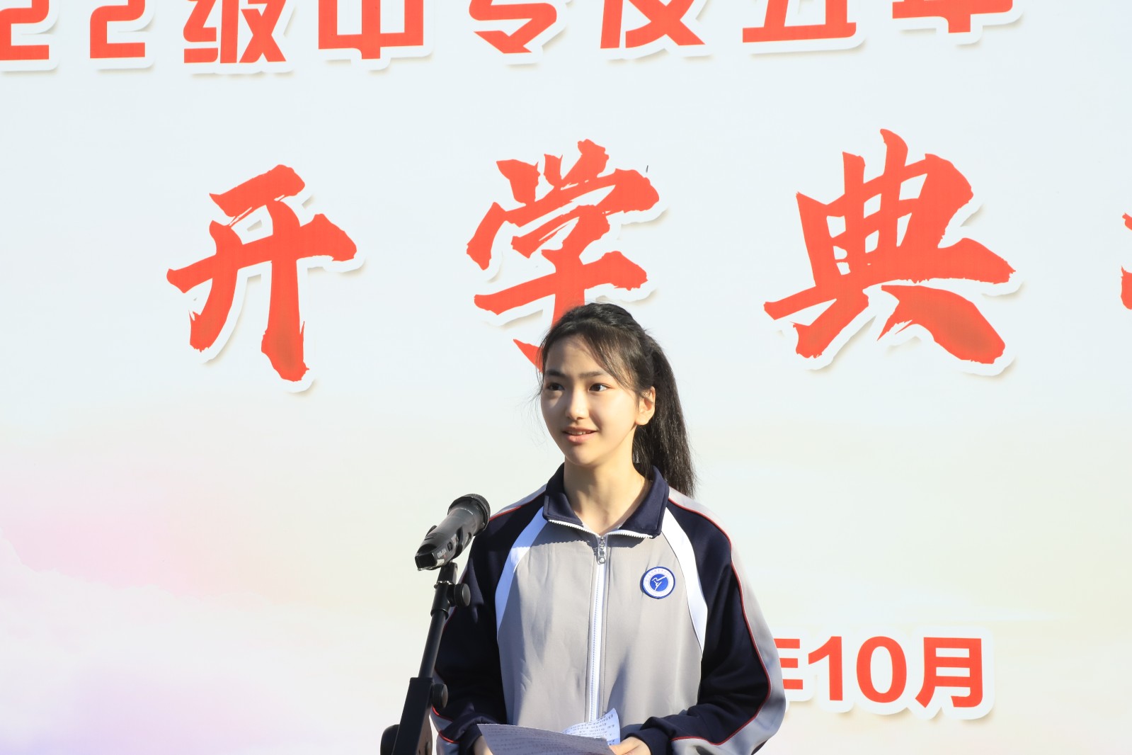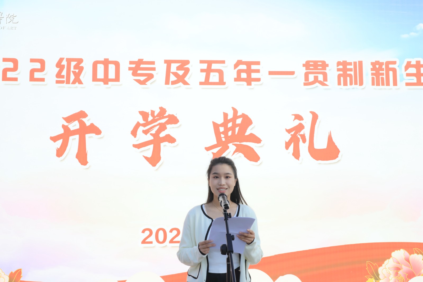 戏剧影视学院2022级戏剧影视表演班学生胡译丹作为新生代表发言。她表达了来到浙艺开启新的学习生活的激动与憧憬,回忆了成长经历中对于艺术的向往。面对未来的高考,她倡导全体同学脚踏实地向前,勤学文化,苦练专业,提高修为。
