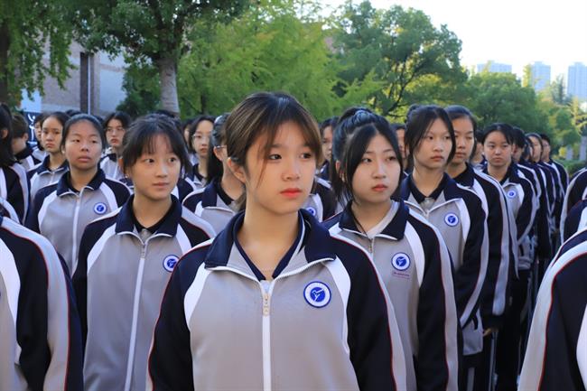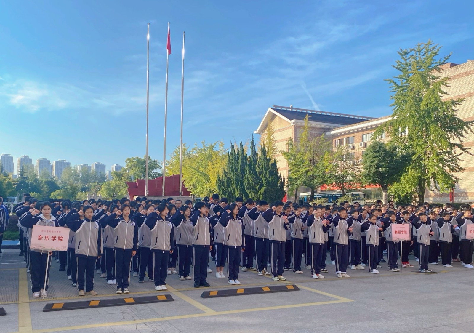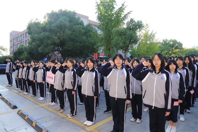 现场举行升旗仪式,齐唱国歌,新生进行集体宣誓。