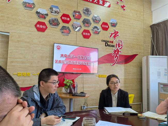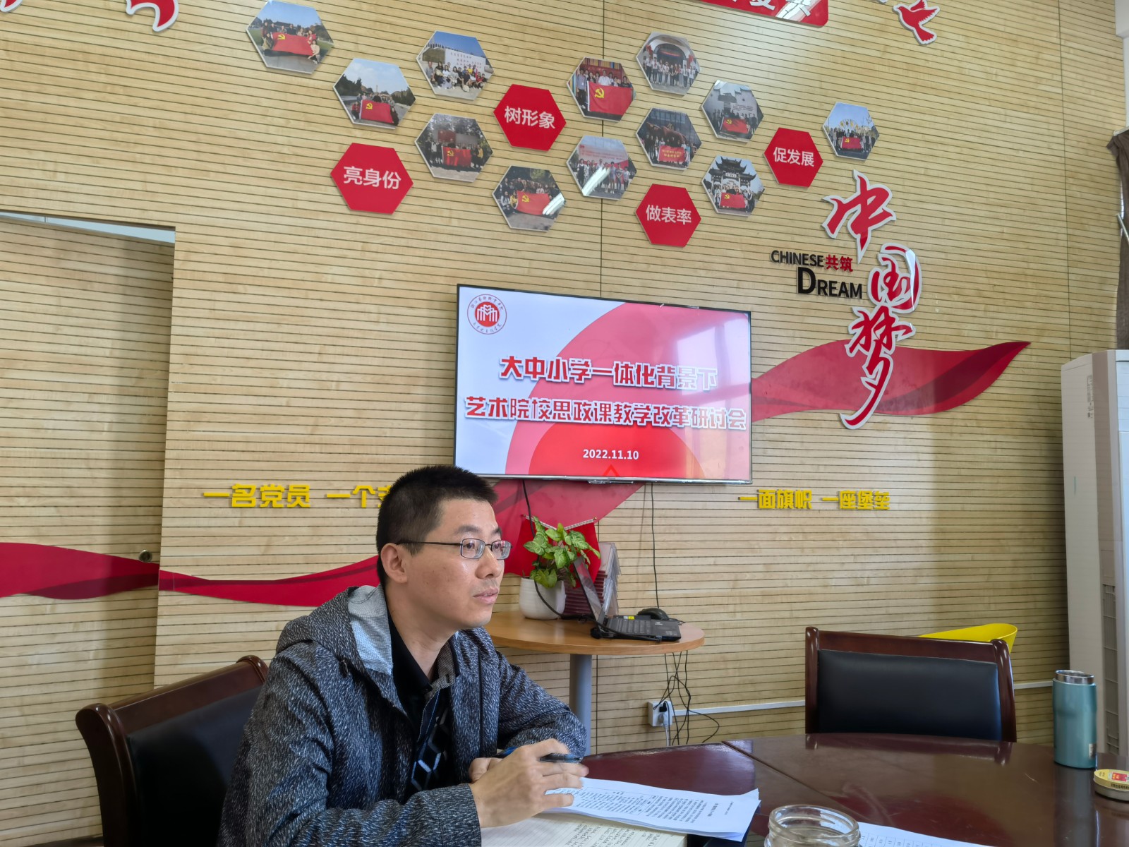 为加强校内不同学段、不同类型思政课的交流融通,探索构建艺术院校纵向贯通、系统科学、有机衔接、螺旋上升的思政课教学共同体,11月10日上午,马克思主义学院在13102会议室举办大中小学一体化背景下艺术院校思政教学改革小型研讨活动。马克思主义学院全体思政教师参会,特邀基础教学部(公共体育部)综合教研组组长朱佩佩,戏剧影视学院党总支专职副书记、中职段任课教师许瑛,戏剧影视学院组织员、初中段任课教师江晓新参加。