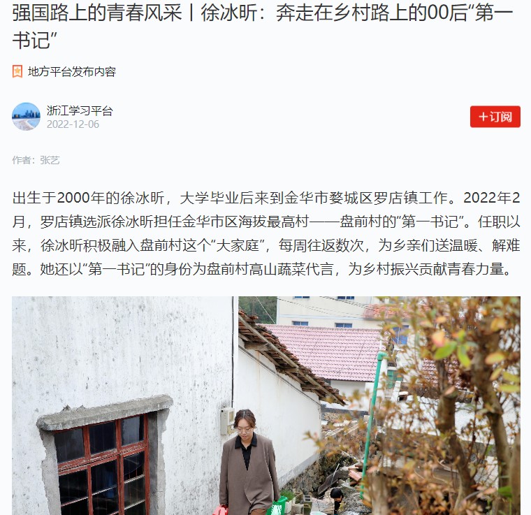 学习强国浙江平台:强国路上的青春风采丨徐冰昕:奔走在乡村路上的00后“第一书记”