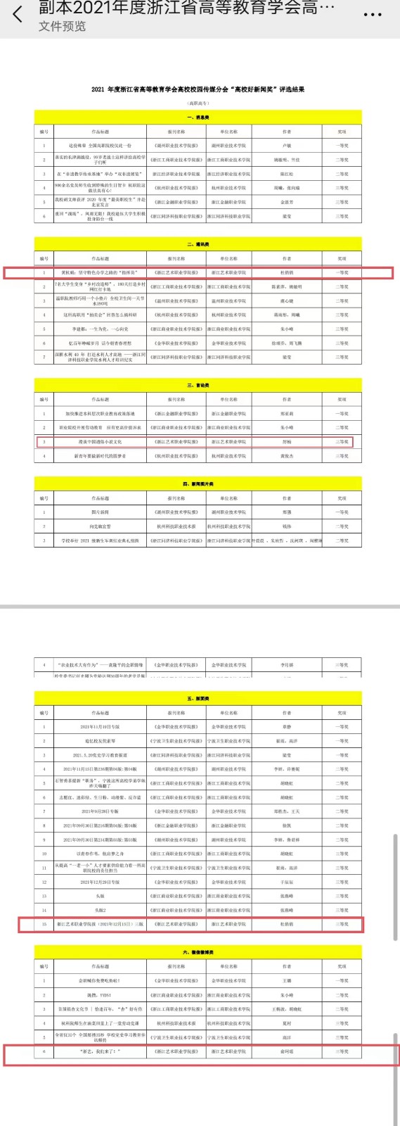 在2022年上半年公布的2021年度浙江省优秀教育新媒体评选活动结果中,浙艺荣获浙江省高校(高职高专)新媒体综合力十强。在2021年浙江教育政务新媒体传播力月排行榜和2022年季度排行榜中,浙艺多次进入全省高职院校前十强。在2022年中国青年报·中青校媒“传承的力量——教师节”全媒体传播系列活动中被评为“优秀组织”。