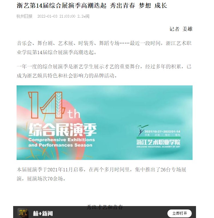 杭州日报:浙艺第14届综合展演季高潮迭起 秀出青春 梦想 成长