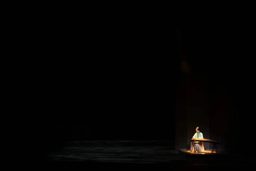 同样令人印象深刻的《竹林七贤》,加入了现代舞的元素,一位“古代男子”于台前起舞,屏风将七位乐器演奏者分隔在后。舞台以音乐的缓急为空间变化的分割点,随着音乐的激烈,屏风展开舞者行至舞台后方,此时舞台的焦点从舞者转换成了乐者。