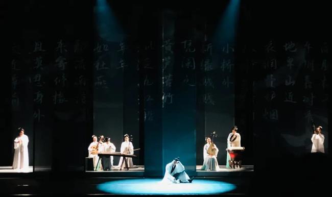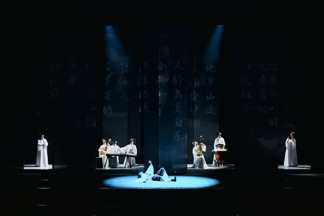 不同于我们通常想象中的音乐会形式,《听见江南》从演奏者服装、灯光、舞美等多方面进行创造性的实验,融合了诗词、绘画、书法等艺术形式,以多媒体数字科技赋能,呈现沉浸式、多元交互式的乐、舞、诗、画独造空间,让观众体验中国古典文化艺术意境。