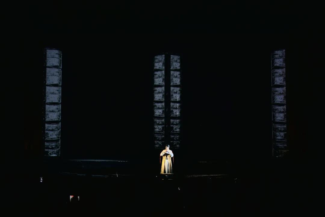还有对于舞台升降台的利用,《良渚回响》乐曲以埙乐开始,吹埙者缓缓从台前升起,演员随着埙乐融入舞台的黑暗中,营造“先声夺人”的效果。