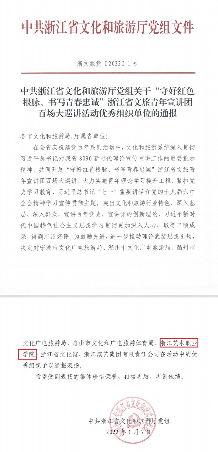 宣讲活动前期,我校党委宣传部协助厅直属机关党委承办省文旅系统青年宣讲团培训组织工作,并派出8名师生参加培训和参加厅宣讲团赴全省各地宣讲。在宣讲活动中,8位宣讲员紧扣党史学习教育、习近平总书记“七一”重要讲话精神和党的十九届六中全会精神学习宣传贯彻主题,突出浙艺特色,深入基层、深入群众,传播党的声音,讲好中国故事,让党的创新理论“飞入寻常百姓家”,宣讲活动获得广泛好评。