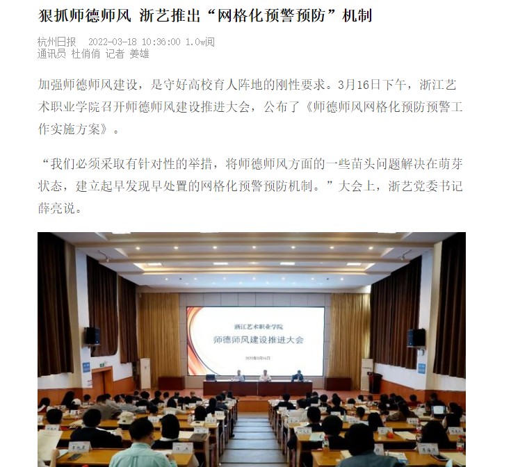 杭州日报:狠抓师德师风 浙艺推出“网格化预警预防”机制