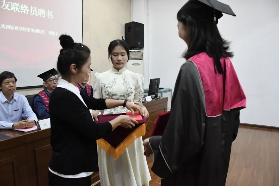 郑怡文为20表演(专升本)班校友联络员蔡梦玲颁发聘书。