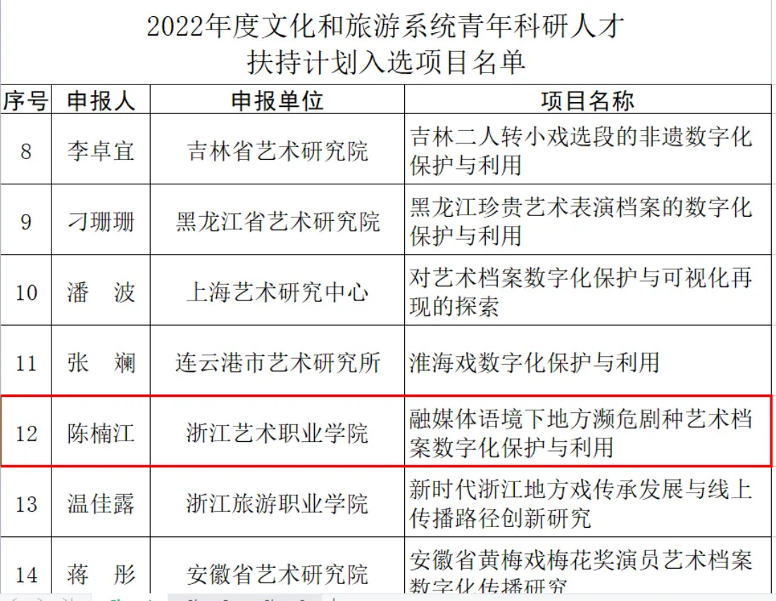 近日,文化和旅游部办公厅公布了2022年度文化和旅游系统青年科研人才扶持计划项目入选名单,经层层评审复核,全国共有36个项目入选。戏剧影视学院影视系主任、影视多媒体教研室主任陈楠江入选该项目。