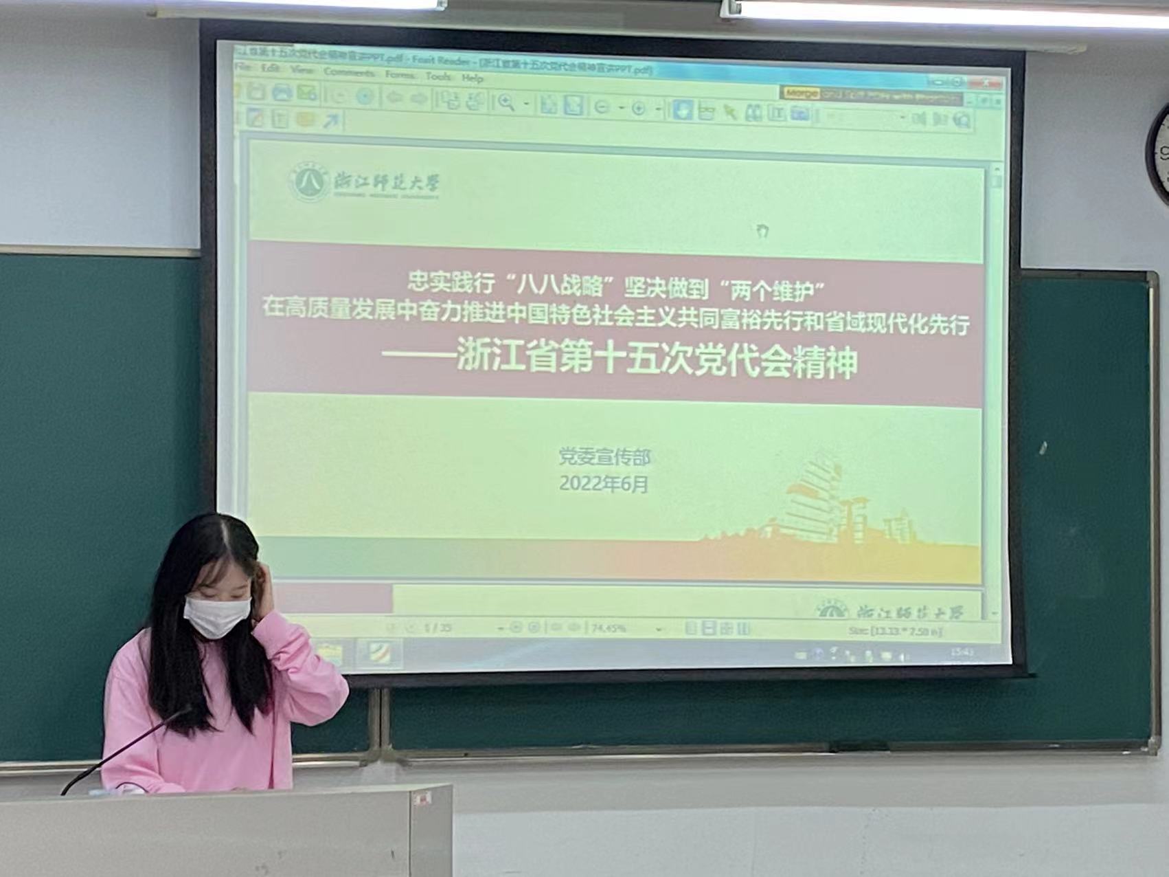 课上,党员联系老师为同学们解读了浙江省第十五次党代会精神,带领同学们共同讨论“两个先行”的具体内涵和精神内涵,引导学生思考作为未来的文艺工作者如何在建设新时代文化高地、推进“两个先行”、服务文化共富中贡献青春力量。