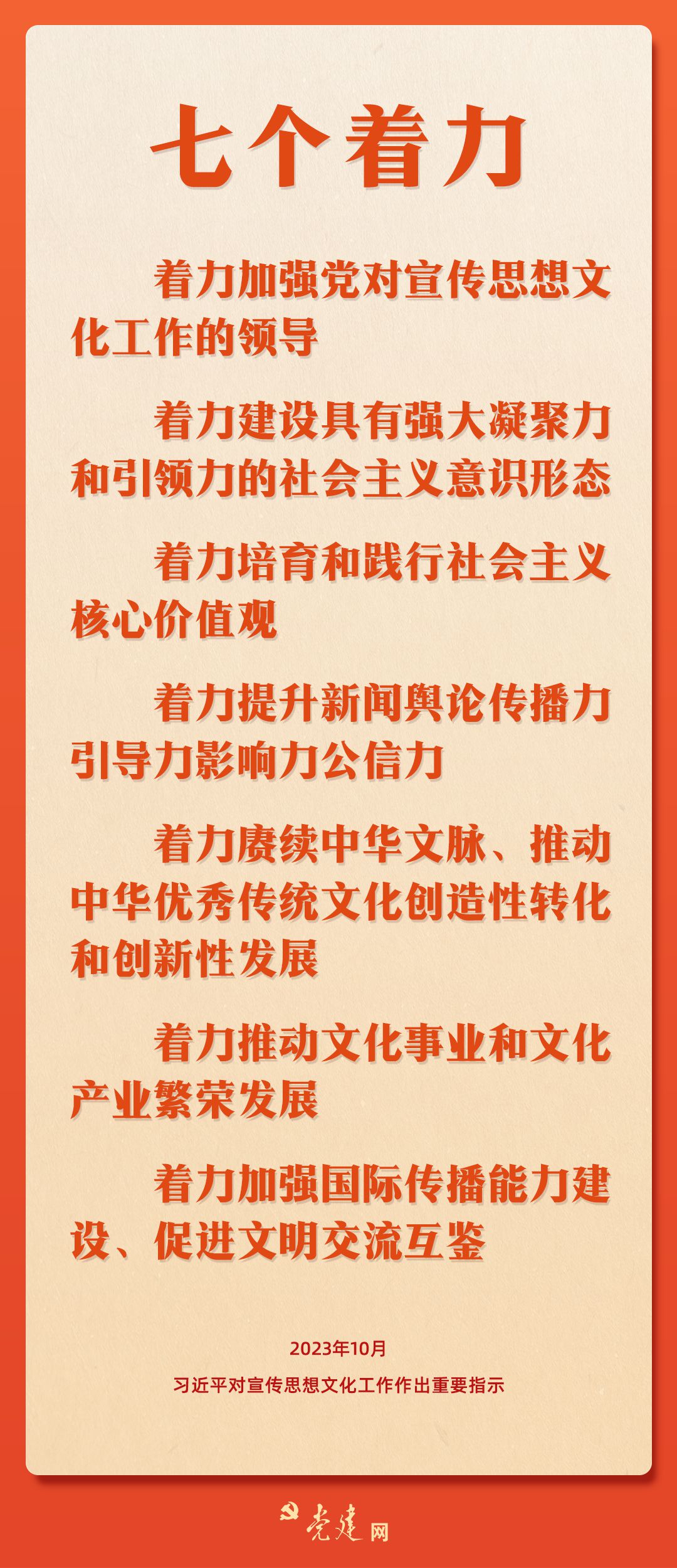 会议指出,习近平文化思想为人类文明发展贡献了中国智慧,为文化强国建设擘画了蓝图路径,为做好宣传思想文化工作提供了重要指引、带来了重大机遇。我们必须坚持守正创新、奋勇争先,在继续推动文化繁荣、建设文化强国、建设中华民族现代文明的实践中创造新辉煌,为全面建设社会主义现代化国家、全面推进中华民族伟大复兴提供坚强思想保证和强大精神力量。