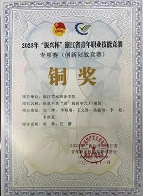 近日,由共青团浙江省委、浙江省人力资源和社会保障厅联合举办的2023年“振兴杯”浙江省青年职业技能竞赛专项赛(创新创效竞赛)落下帷幕。经过激烈的角逐,由设计学院服装与服饰设计专业教师项敢、巴蕾老师指导学生刘一博、李斯瑜、王文静、吴嘉琳、李姣、李新夏的作品《创意不离“谱”的新中式3D童装》荣获铜奖。