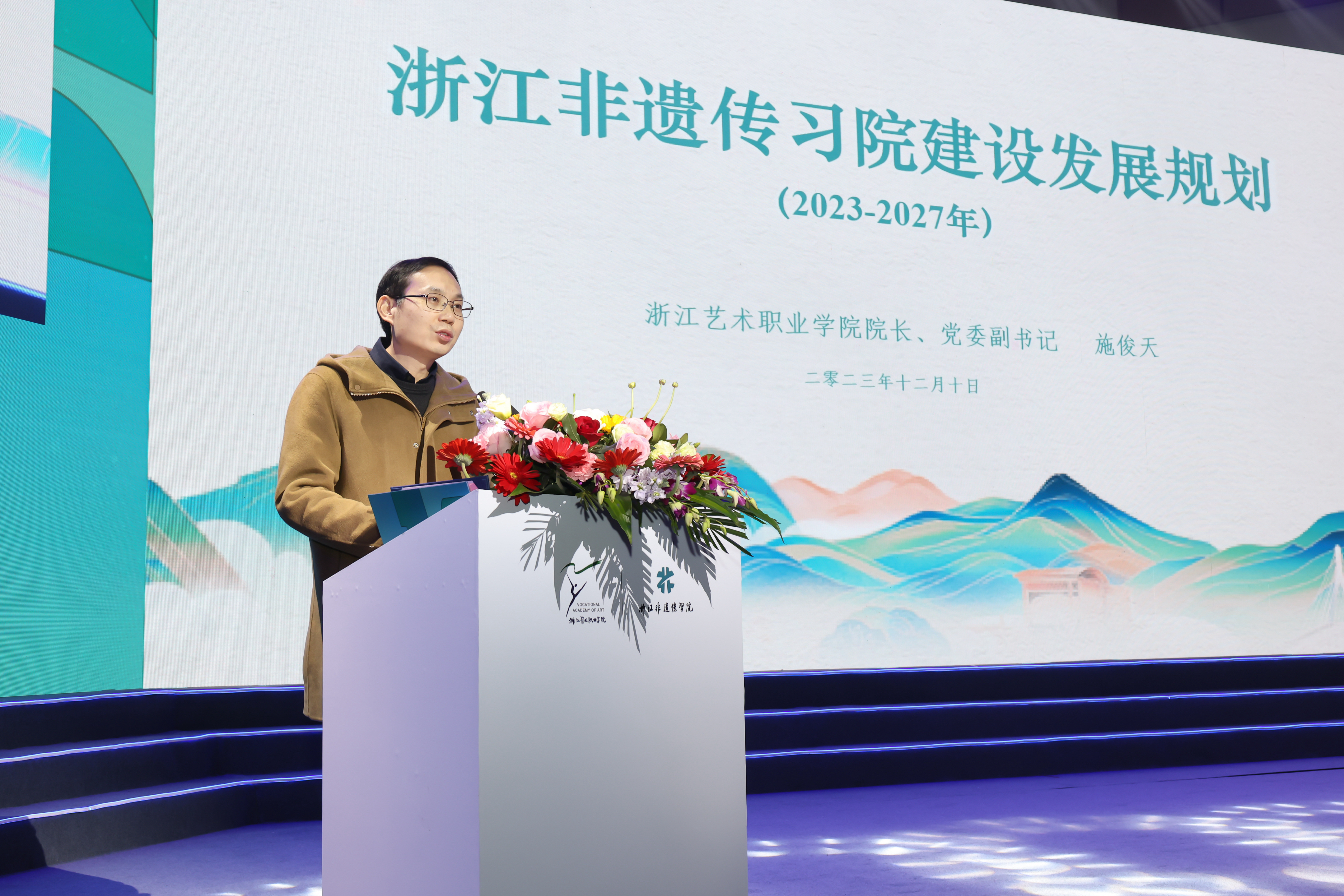 施俊天发布《浙江非遗传习院建设发展规划(2023年-2027年)》。浙江非遗传习院(筹)包括教学部、研究部、产学部等部门。教学部设立教学中心与教务中心,通过优化专业设置,完善课程建设,建成浙江特色高水平非遗专业群,打造非遗保护传承、经营管理与传播的高素质复合型人才培养基地;研究部设立学术研究中心与技术研发中心,建立以非遗研究为特色的浙江省哲学社会科学研究基地、技术研发与非遗文创高地,打造国内职业院校领先的高层级非遗研究与技术技能研发平台;产学部设立产业学院与实践基地,通过校政行企合作,全方位推进产教深度融合人才培养模式改革,打造服务新发展格局的浙江非遗产教融合共同体。