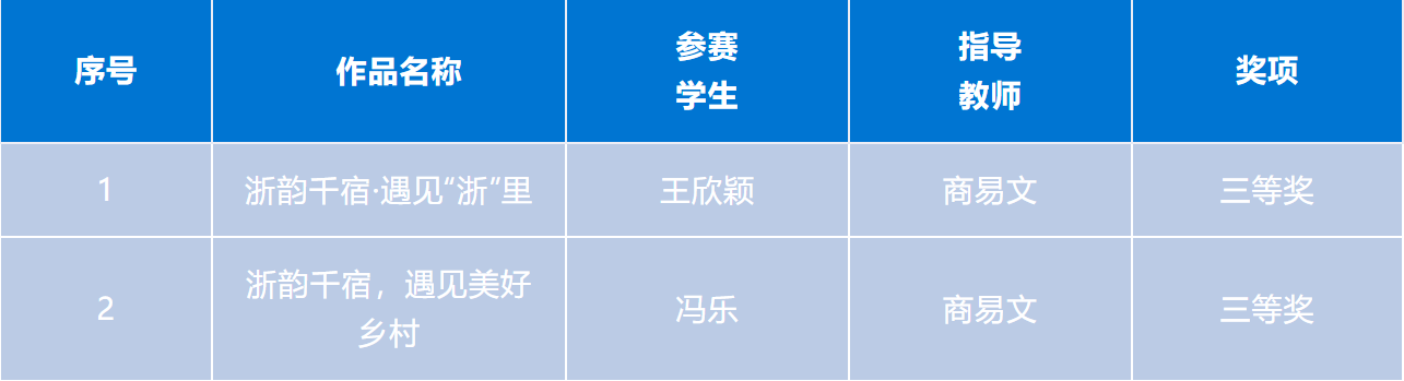 近日,第二十二届浙江省大学生多媒体作品设计竞赛决赛在浙江师范大学举行。由我院广告艺术设计专业商易文老师指导,21级广告艺术设计专业的学生王欣颖创作的《浙韵千宿·遇见“浙”里》和冯乐创作的《浙韵千宿,遇见美好乡村》在比赛中荣获三等奖。