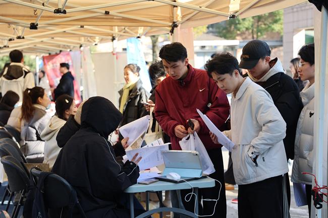 招聘会现场,2024届毕业生着装整洁,手持简历,认真浏览招聘企业信息,寻找自己感兴趣的岗位,积极主动地与企业招聘人员沟通、交流,介绍自己的个人情况和专业优势。